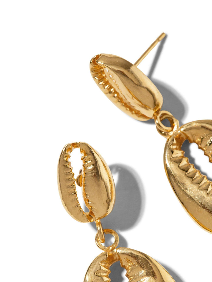 These Gold Cowrie Drop Earrings by Jaredjamin are a classic, retro accessory. The 18K gold-plated cowrie shells add a touch of effortless, beach-inspired elegance, perfect for bringing a bit of summer to any season. These lightweight earrings are comfortable for all-day wear and are a must-have for those who love retro, chic accessories.