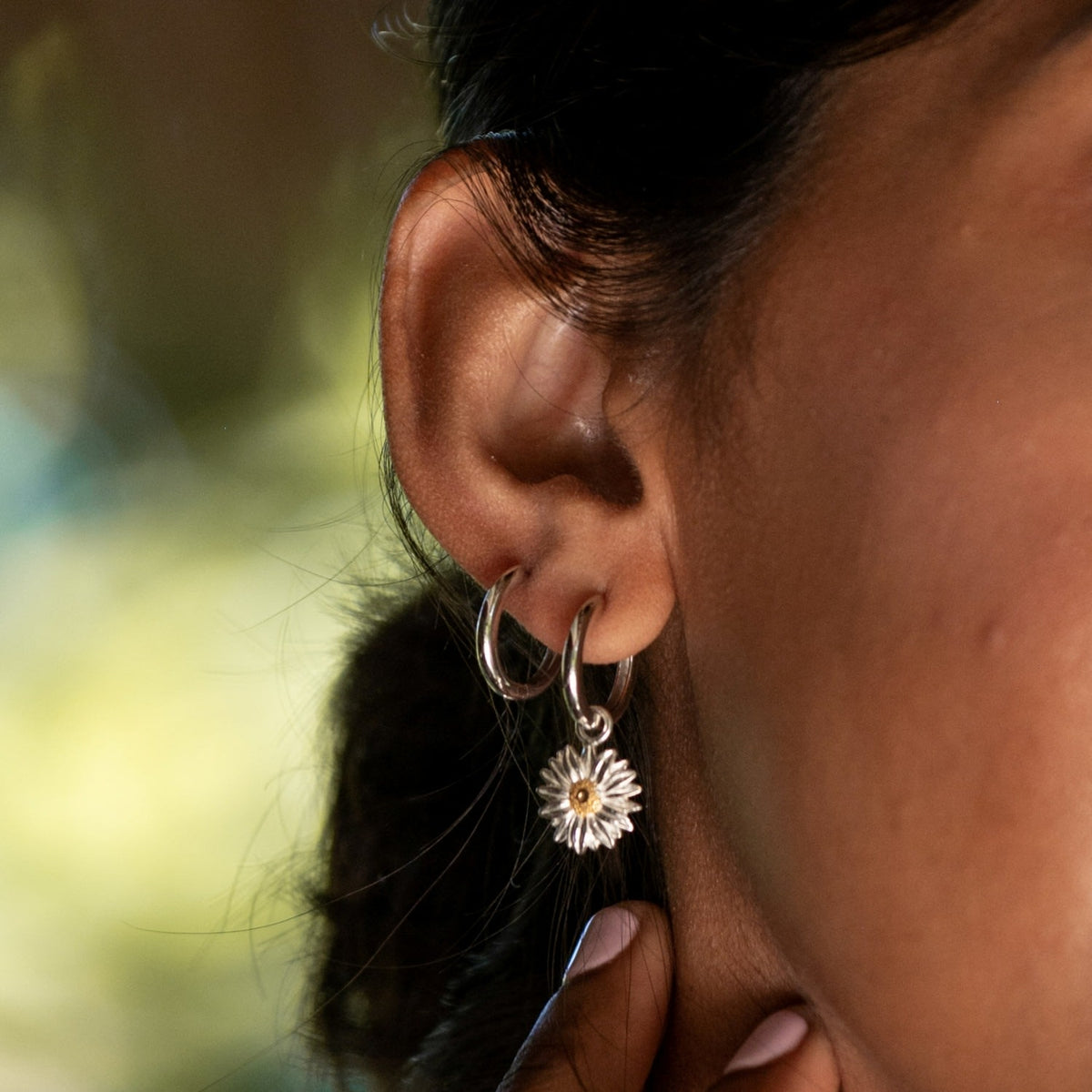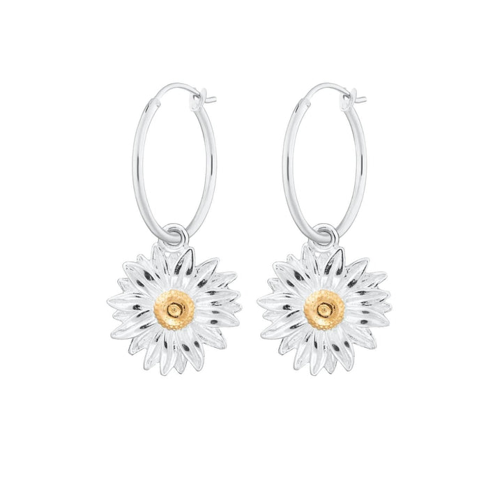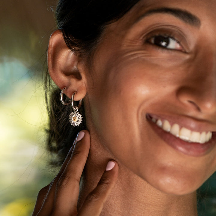 Recycled 925 sterling silver. 18ct gold-plated detailing on daisy centers. Charm hoop earring design.