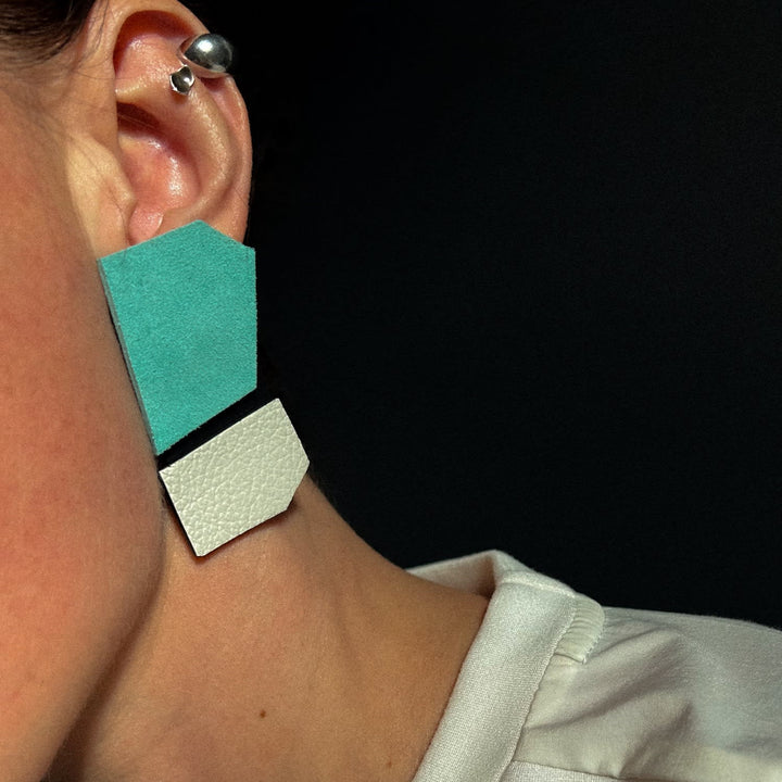 These Angl Leather Earrings Turquoise by Waiwai showcase asymmetry at its best. These lightweight leather earrings balance sharp edges with a soft, tactile finish. Hand-cut and layered with a vibrant turquoise contrast, they shift between structure and movement, creating a look that is geometric yet never rigid. These earrings are an unexpected yet effortless statement piece, perfect for someone who appreciates unique design and a modern, artistic flair.