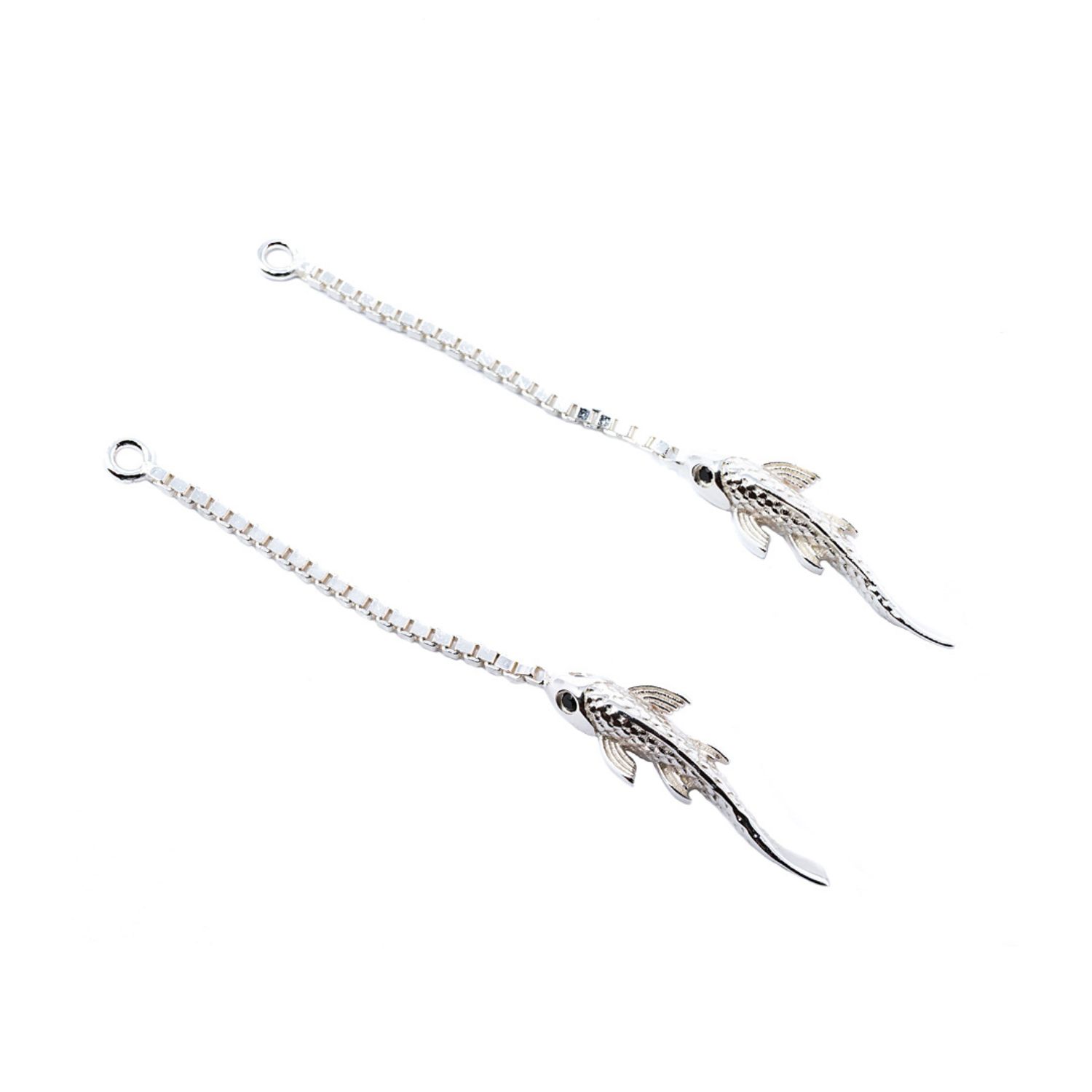 Cast in 925 solid sterling silver. Set with black spinel gemstones in the eyes. Dangling fish design.