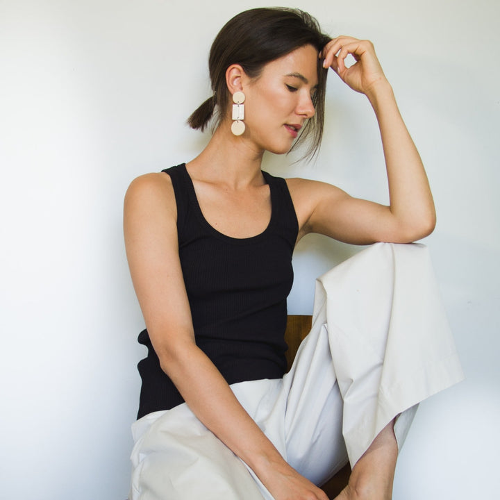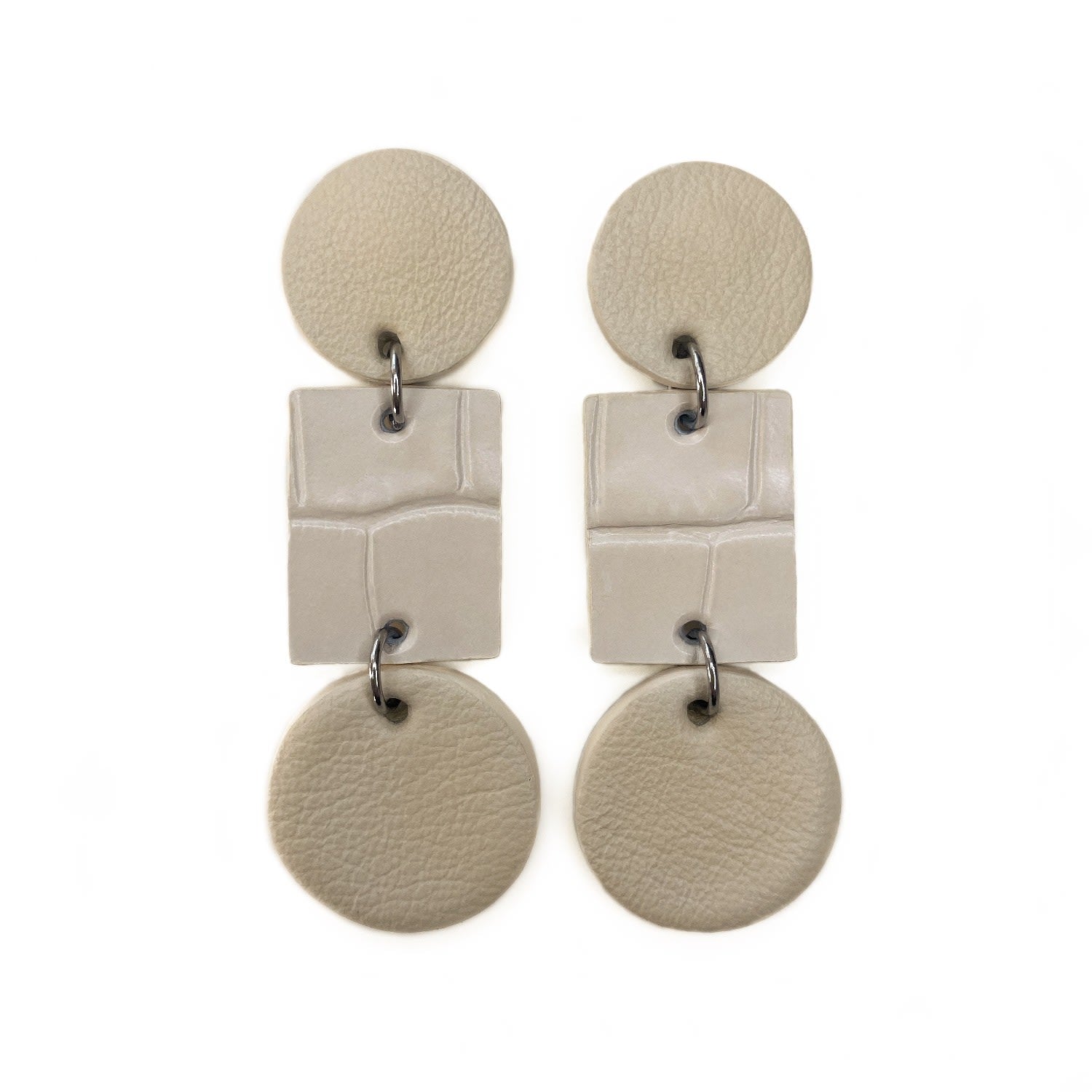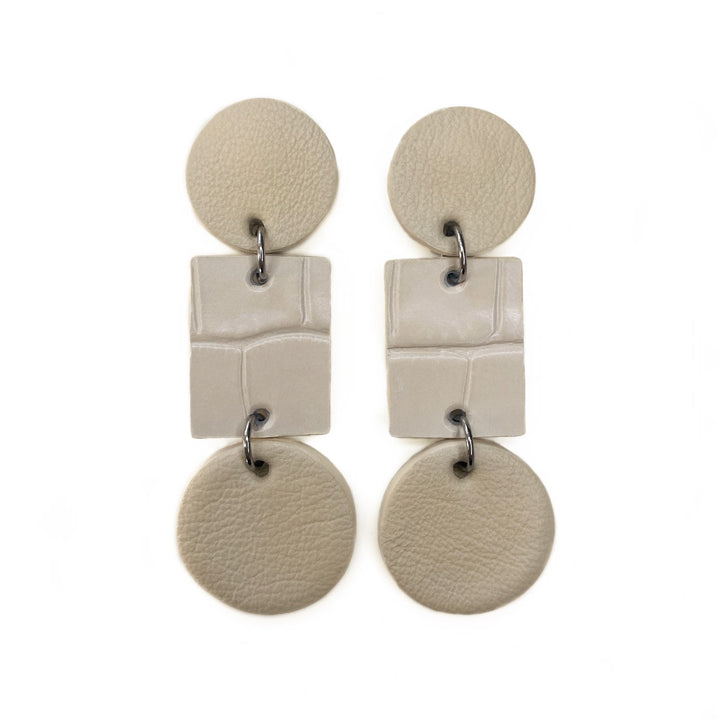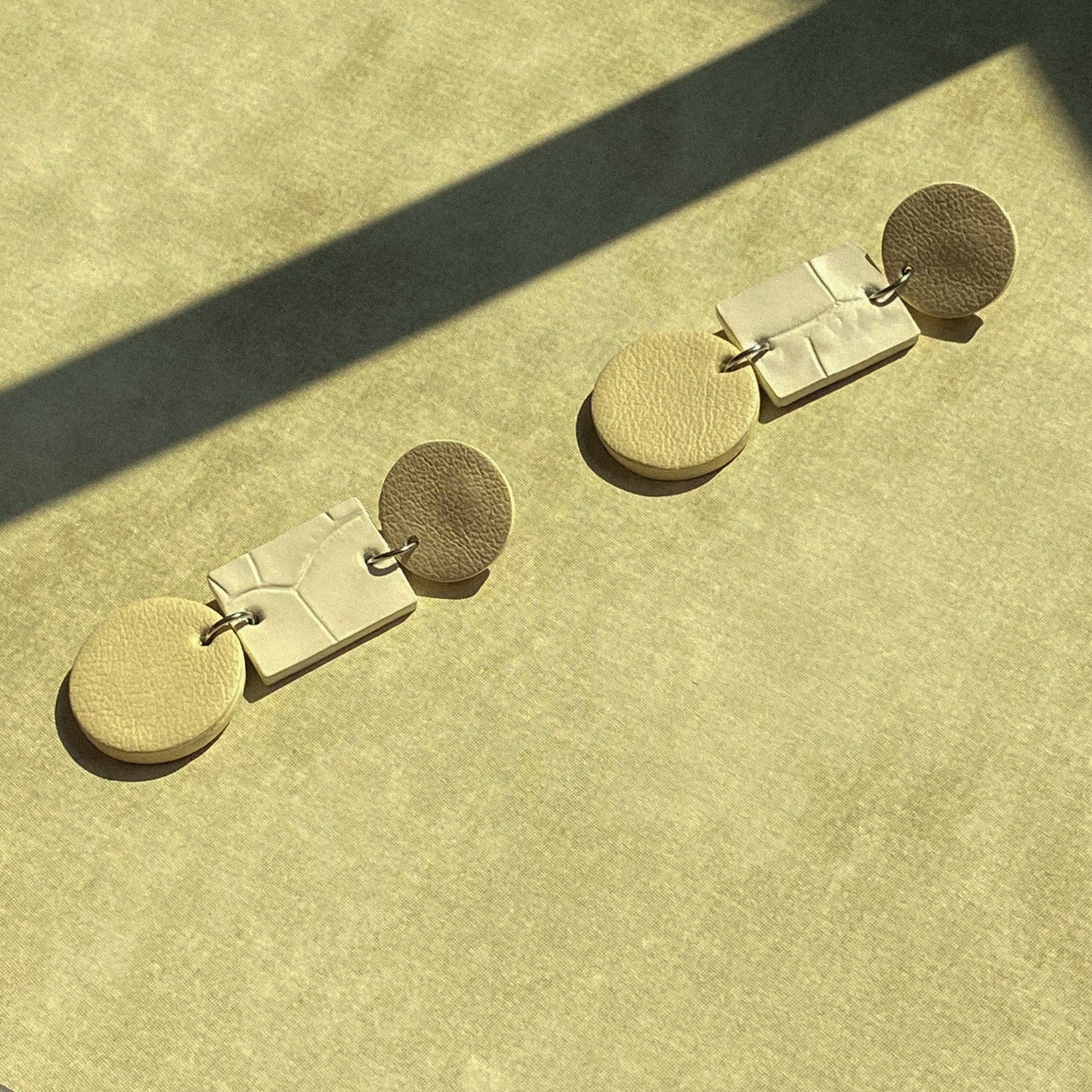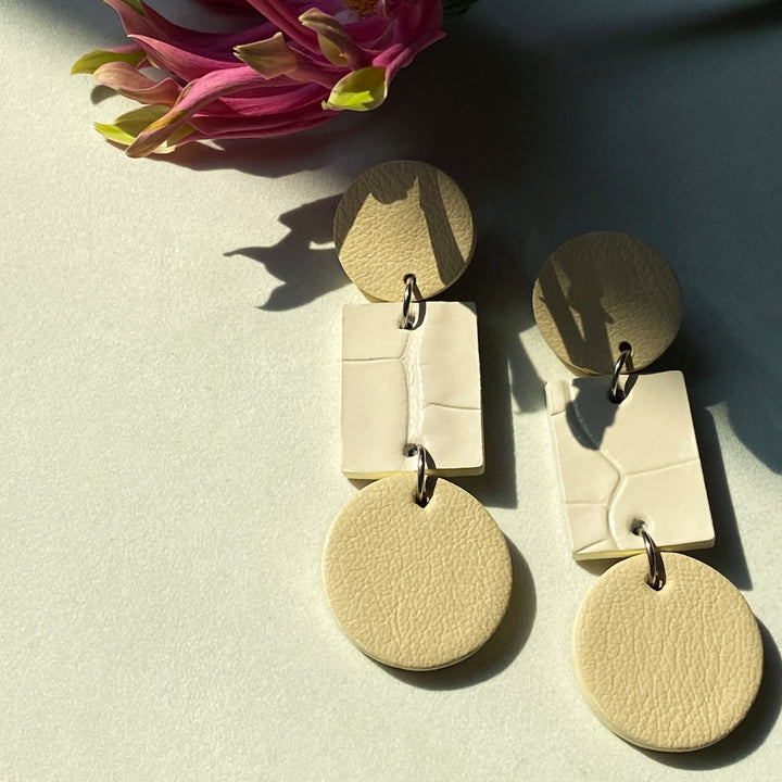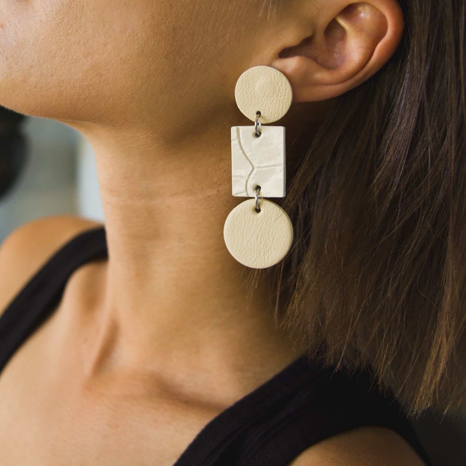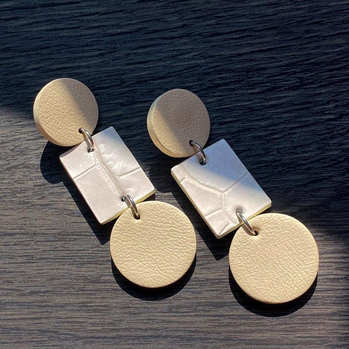 These Texture Fusion Drop Leather Earrings by Waiwai are a unique and stylish accessory. They feature a harmonious interplay of shapes and textures, with two smooth leather circles and a central rectangle made from repurposed alligator leather. These lightweight, stud drop earrings are designed for all-day comfort and are a chic way to showcase your commitment to sustainability without compromising on elegance.