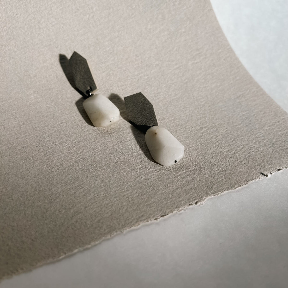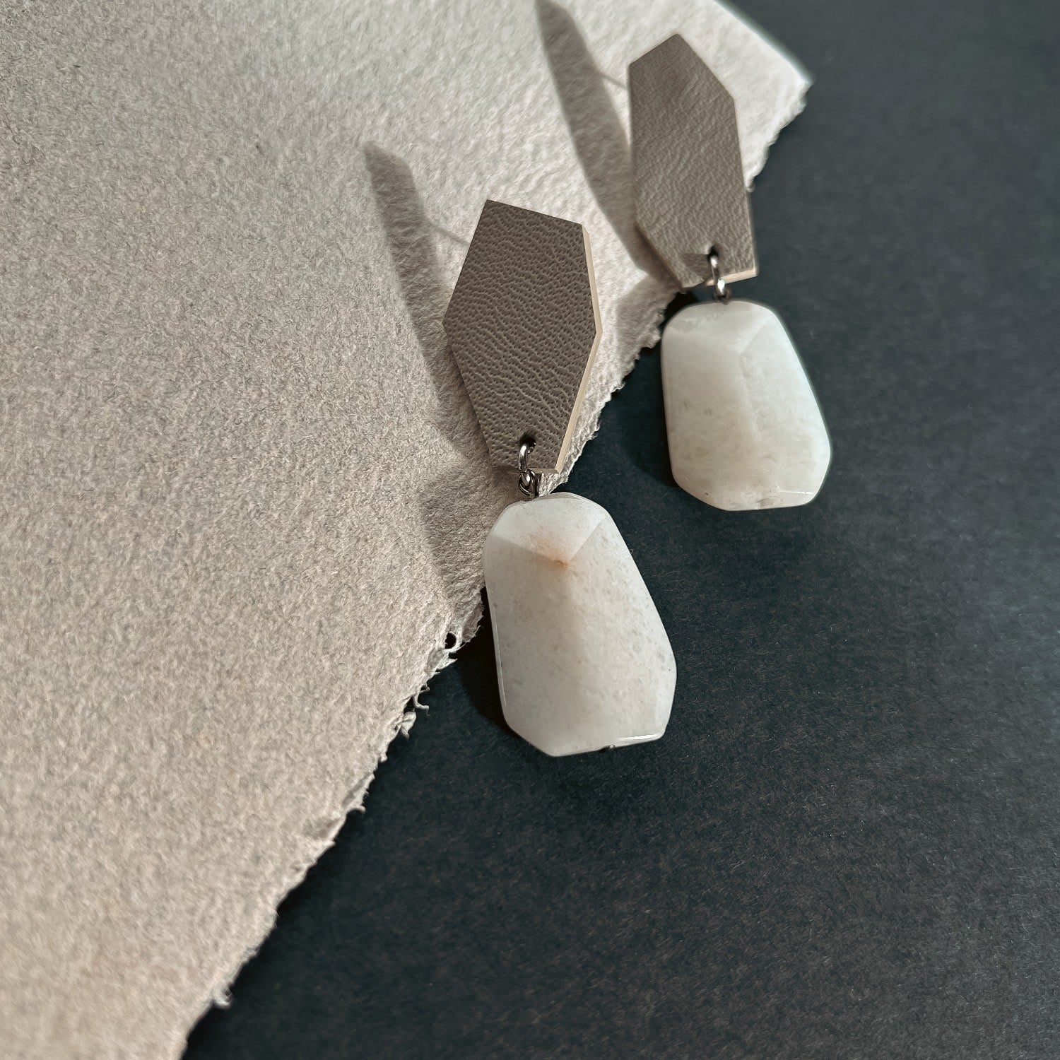 These earrings are crafted from ethically sourced leather and feature white jade stones. They are a single pair.