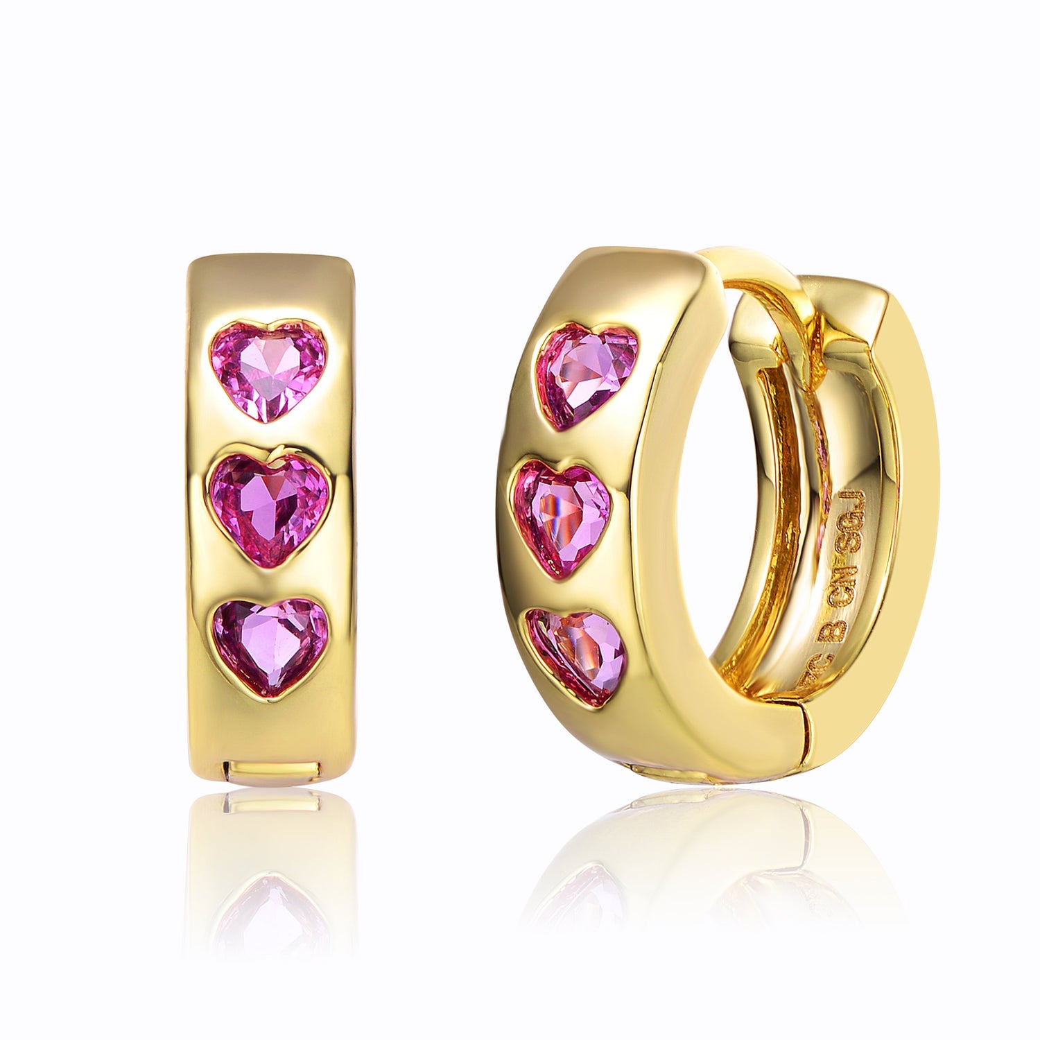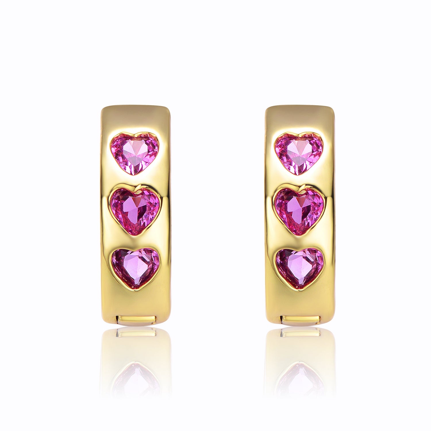 These hoop earrings are plated with 14k yellow gold. They feature three heart-shaped pink simulated cubic zirconia.