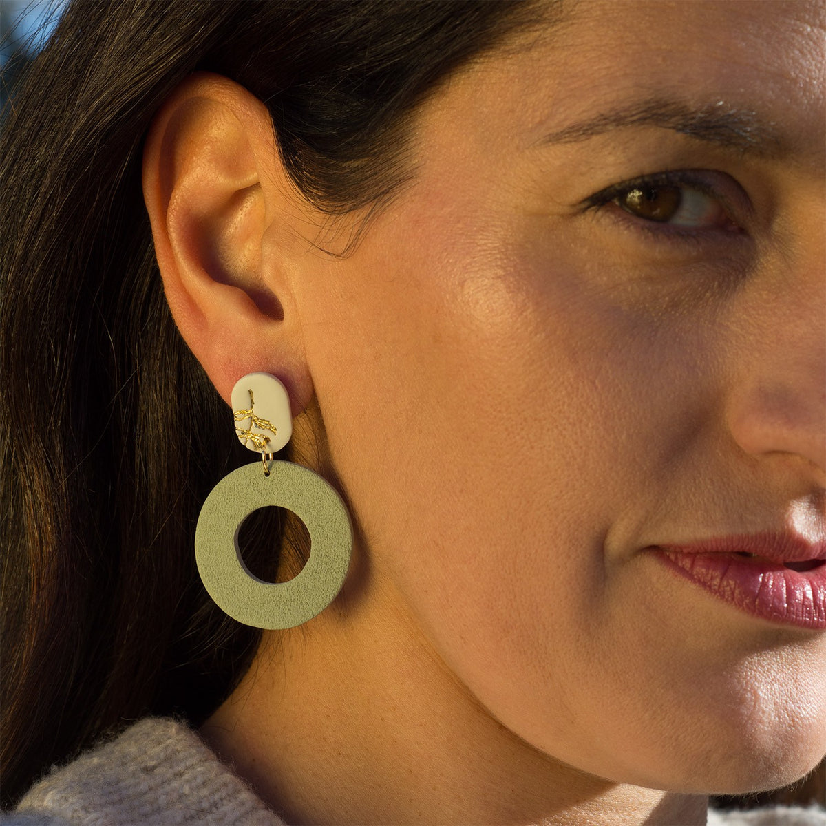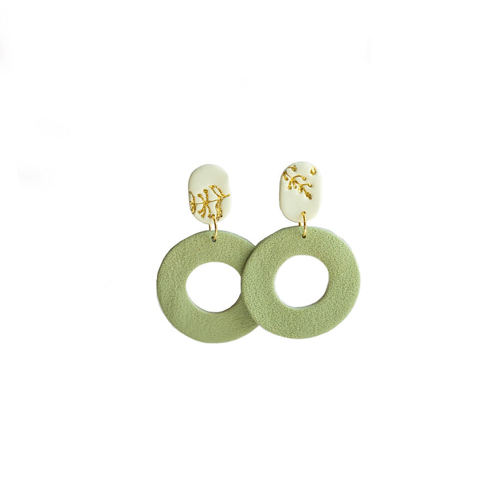 These Ruth Green and White Textured Round Earrings by Ziolla Designs are modern, earthy, and artistic. The white engraved top disc with golden branch detail contrasts beautifully with the textured green circular drop, creating a unique, organic-inspired accessory. Handmade and one-of-a-kind, they embody individuality and subtle elegance.