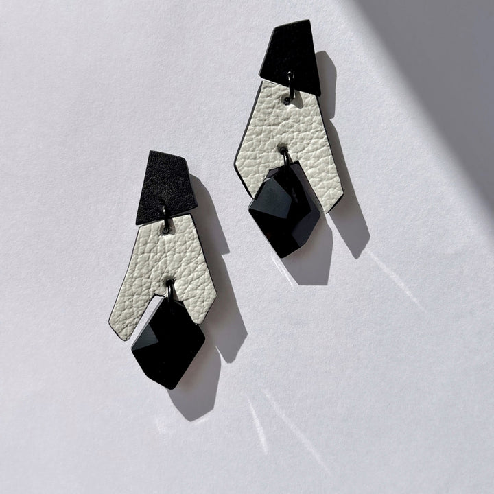 These Black & White Drop Earrings by Waiwai are sculptural yet airy. Crafted from upcycled leather and accented with a faceted Swarovski bead, they create bold contrast with a touch of sparkle. A modern, sustainable statement of creativity and style.