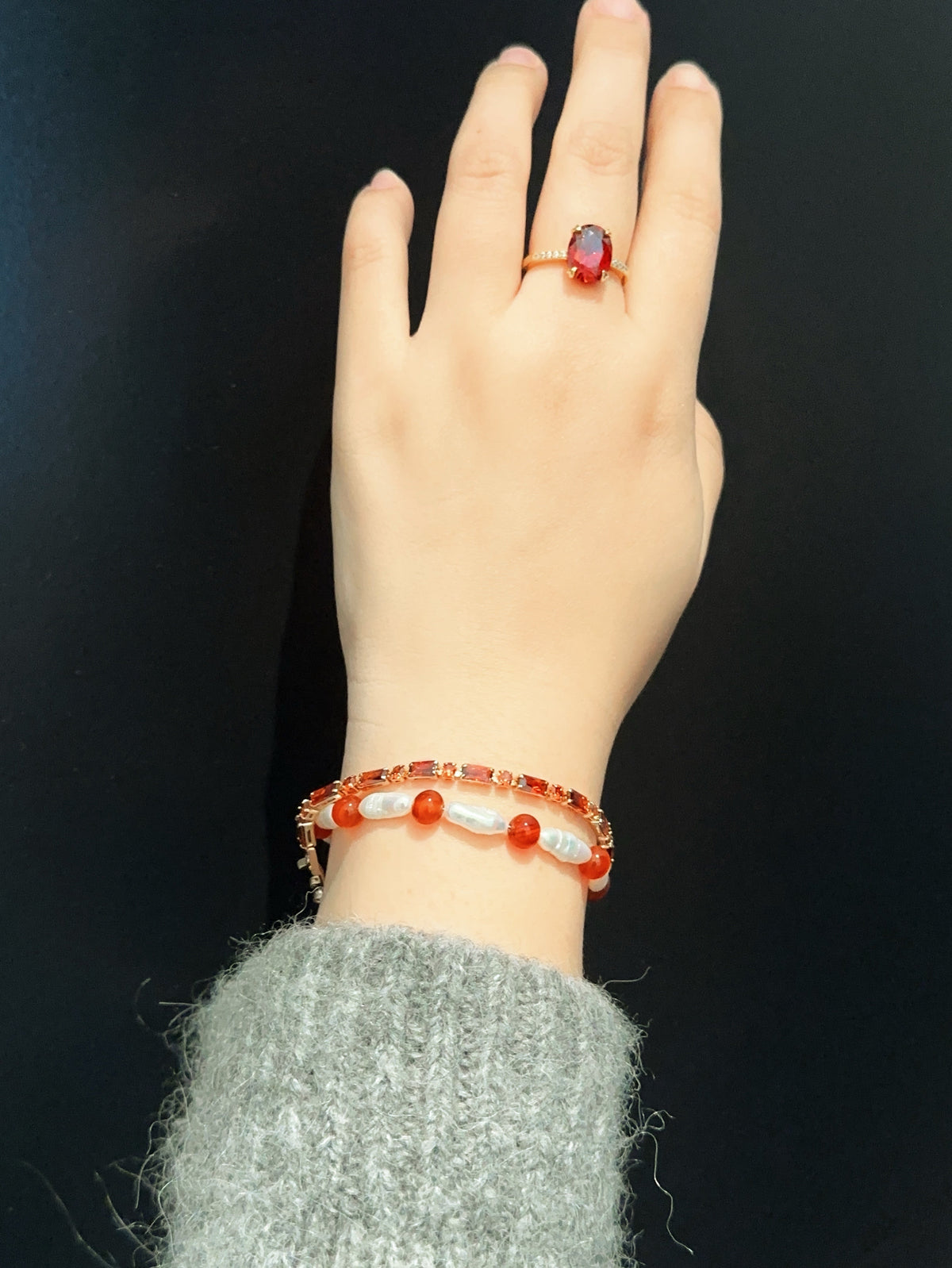 This Red Agate & Lute Pearl Bracelet by Ninemoo is a timeless and elegant accessory inspired by London's St. James's Park. It combines rich red agate with graceful lute pearls for a sophisticated look. The large red agate drop adds a unique touch. Made with Freshwater pearl and Agate, this piece is part of a refined set that can be worn on its own or with matching items.