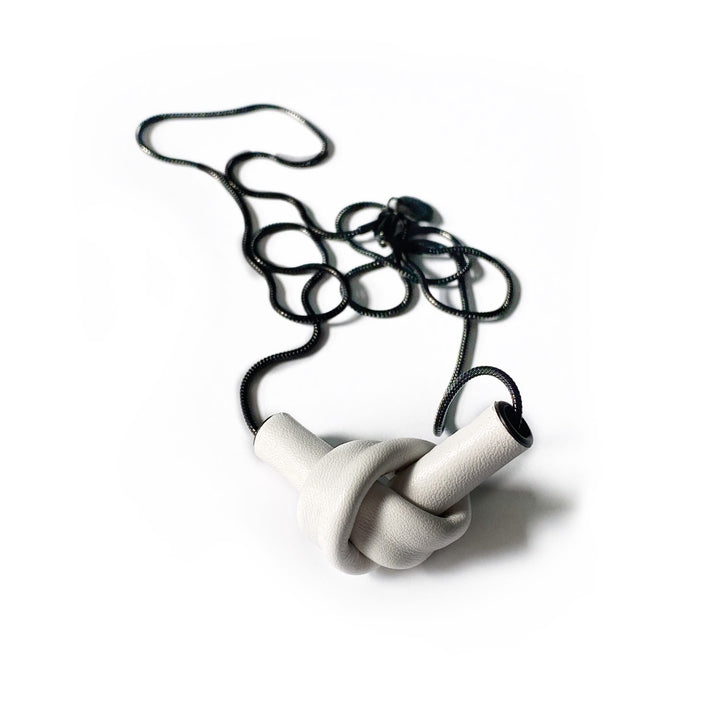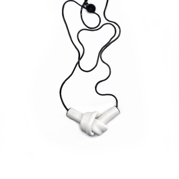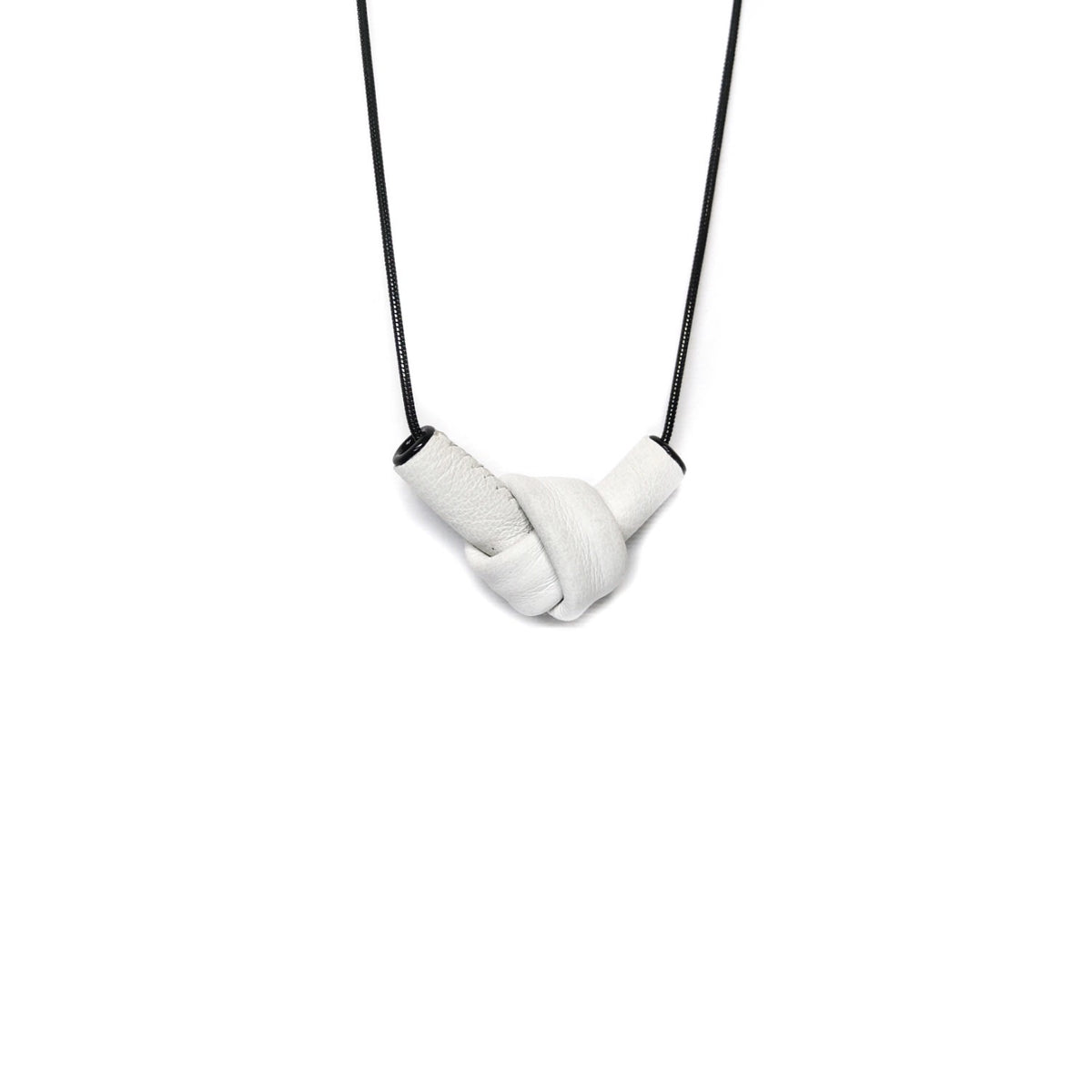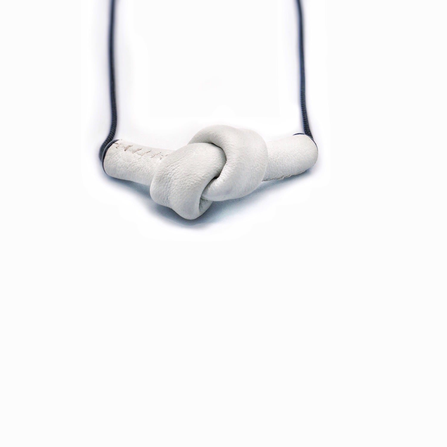 This Leather Knot Necklace White by Waiwai symbolizes eternal connection with its sculptural knot design. Crafted from supple white leather with subtle stitched details, it balances modern sophistication with tactile artistry. Offered in two lengths, it can rest near the collarbone or over the heart for personal styling.