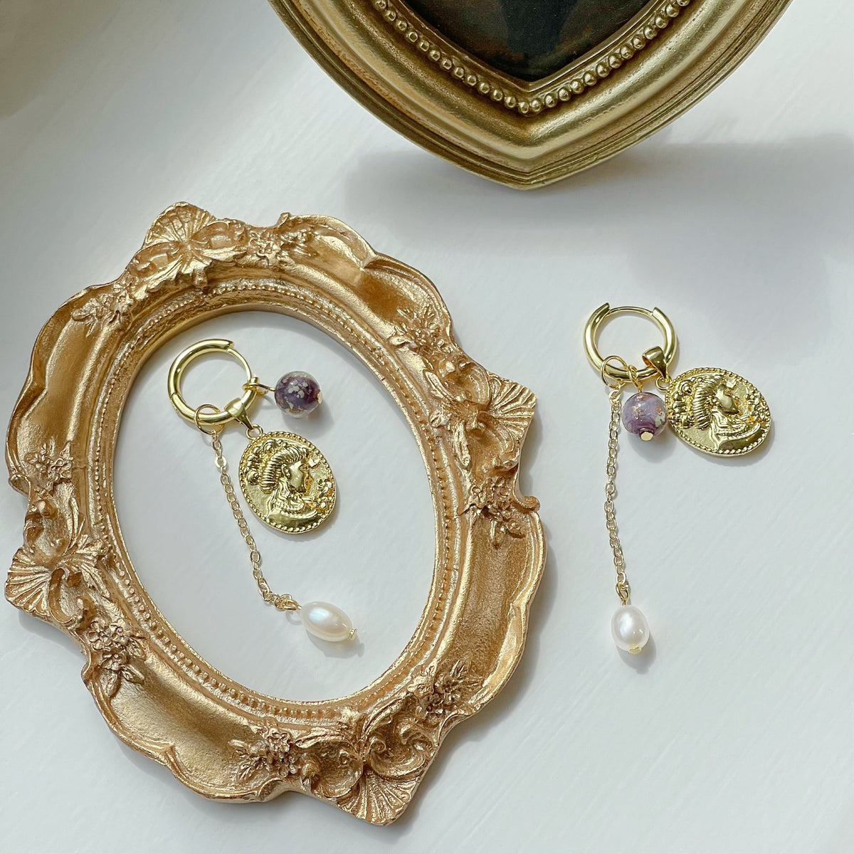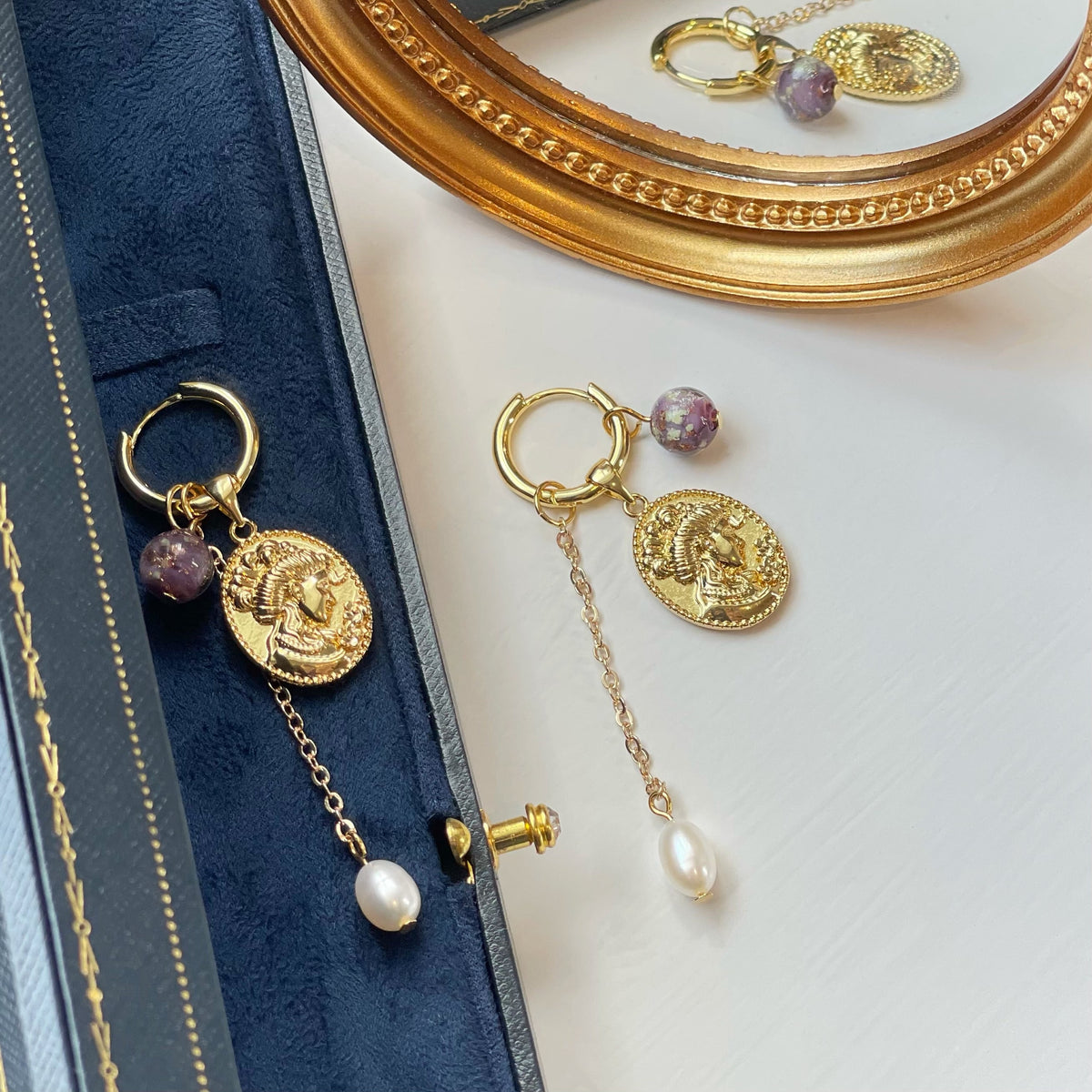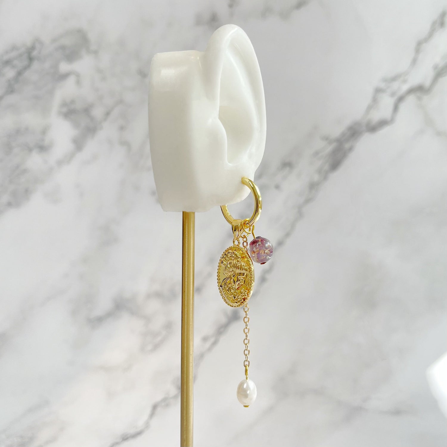 These Goddess Of Fertility And Nature Earrings by Ninemoo pay homage to ancient goddesses. The golden pendant symbolizes divine femininity, while the pearls and purple glass evoke the purity of nature. Made from 925 silver, gold-plated brass, pearls, and glass, these earrings are a beautiful and meaningful accessory.