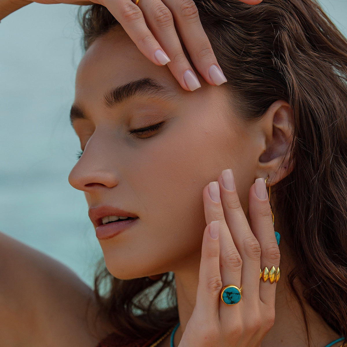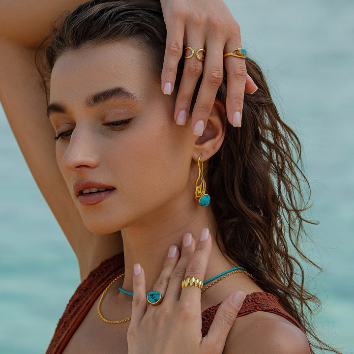 This Signet Gold Turquoise Signet Ring by Mejoma merges classic elegance with modern versatility. Its oval turquoise centerpiece radiates individuality and natural beauty, while the hidden adjustable band ensures a seamless fit. Each turquoise stone is unique, celebrating imperfection and authenticity. A refined yet adaptable accessory, perfect for daily wear or layering with other rings.