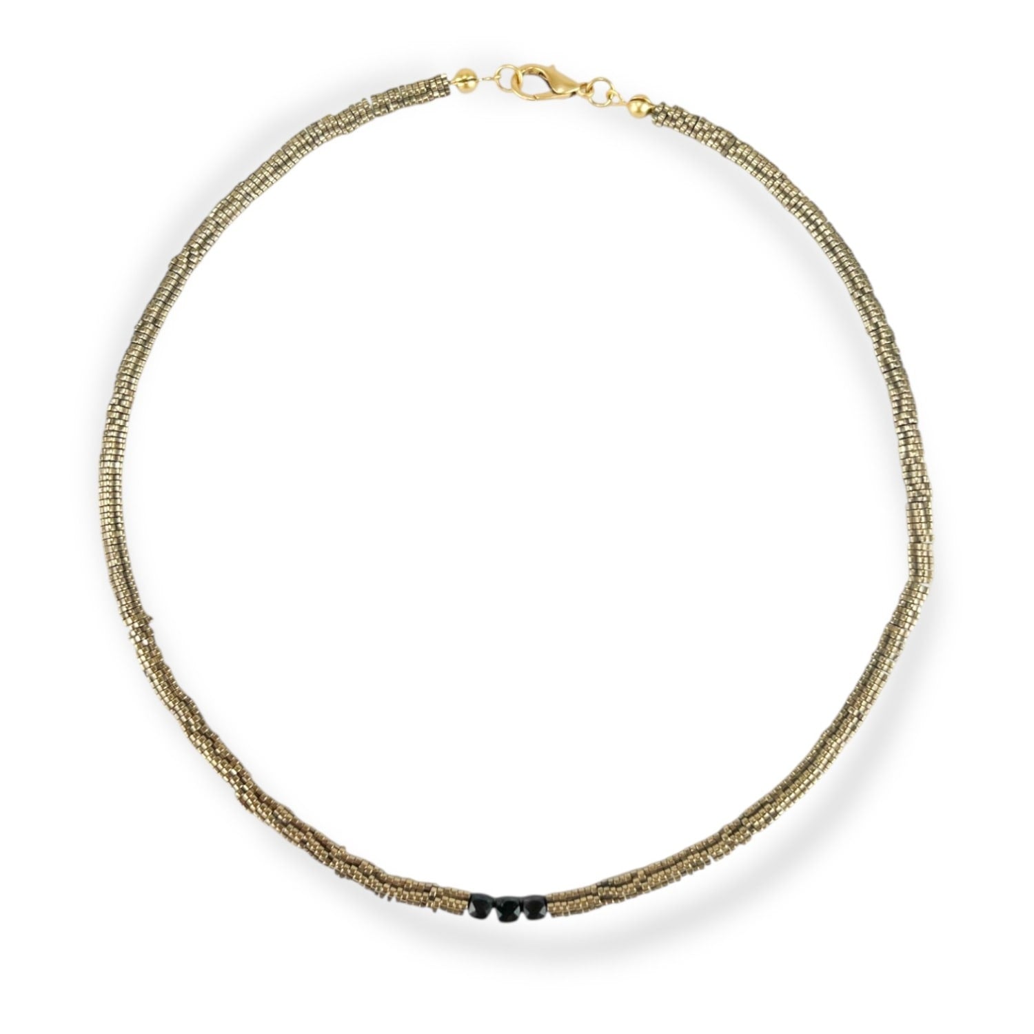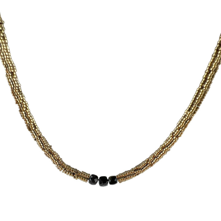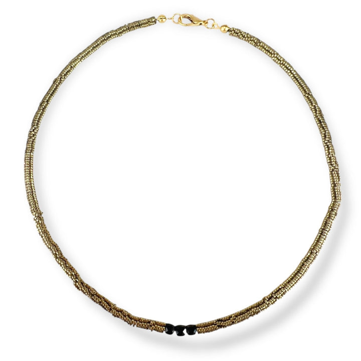 This handcrafted necklace features natural Tourmaline and Hematite stones.
