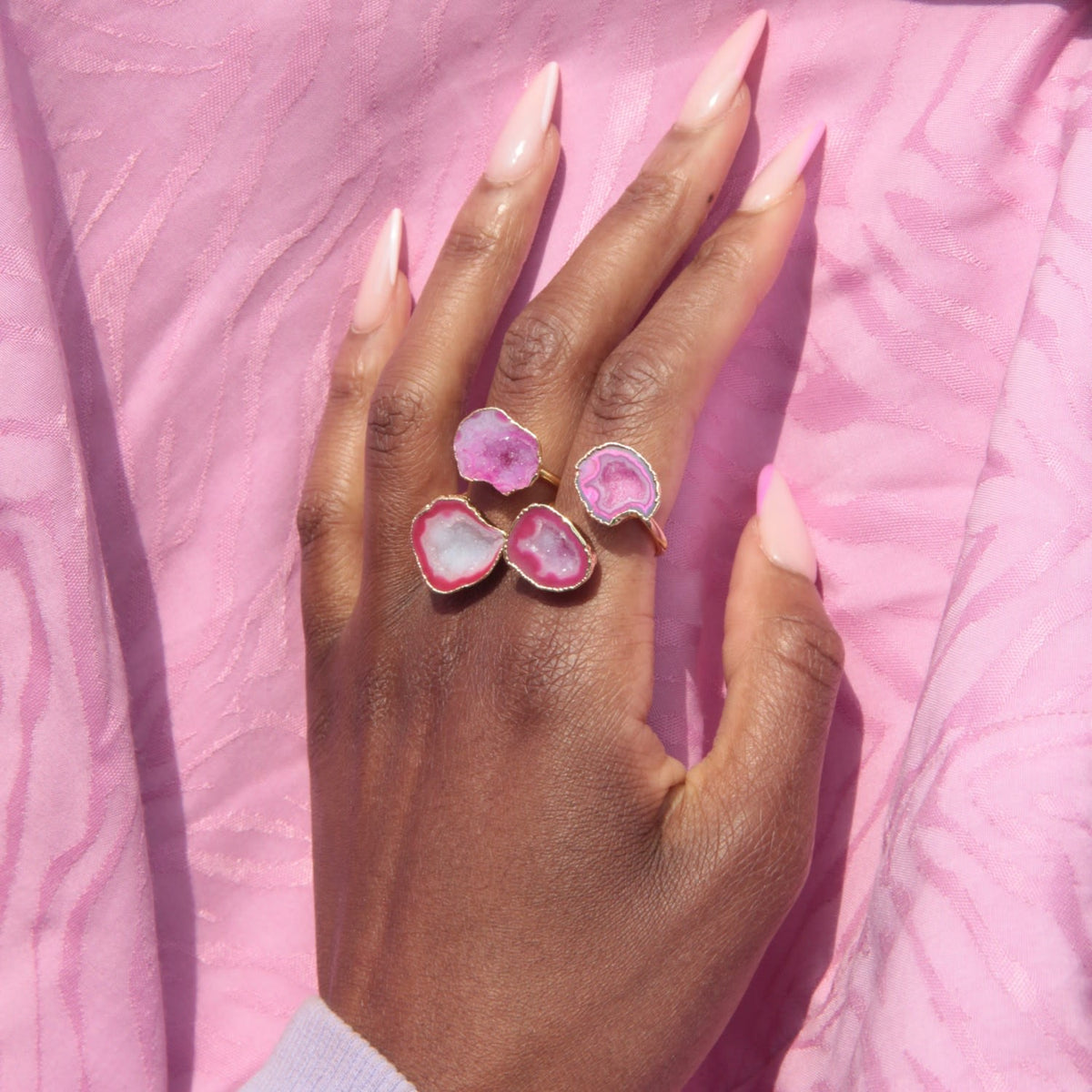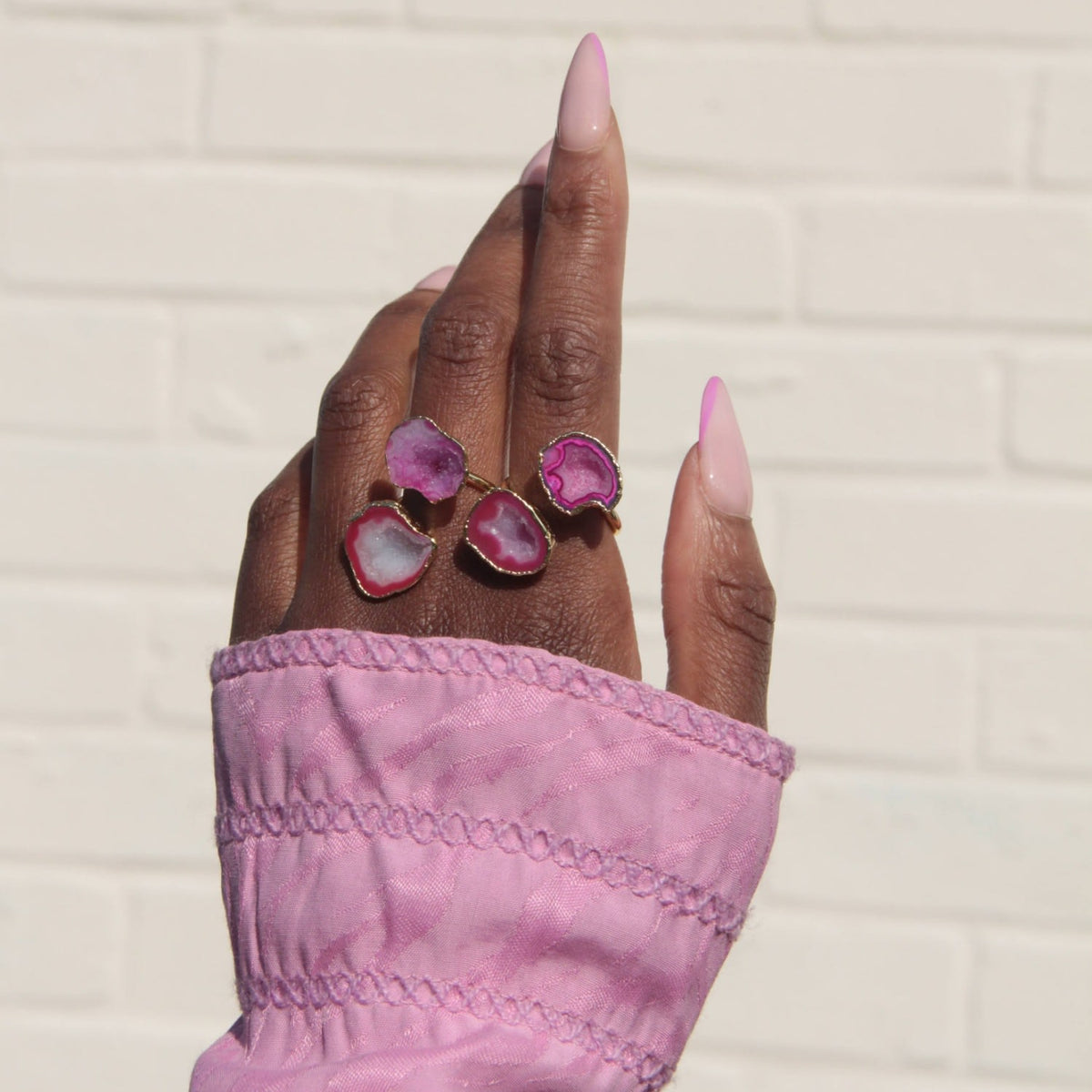 This Berry Duo Crystal Adjustable Gold Ring by Yaa Yaa London is a stunning statement piece that embodies a blend of raw elegance and modern design. It features an architectural square band with a bold, open front, making it adjustable for a perfect fit. The ring is set with unique agate geode crystal stones in attractive pink, red, and jewel tones, which vary in color, size, and shape, ensuring each piece is one-of-a-kind. Its design is perfect for those who appreciate unique, handcrafted jewelry.