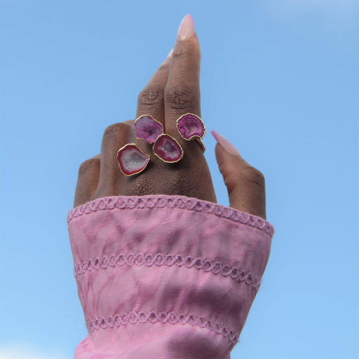 This ring is crafted from a brass metal base and is plated in 24k gold. It is set with natural agate geode crystal stones.