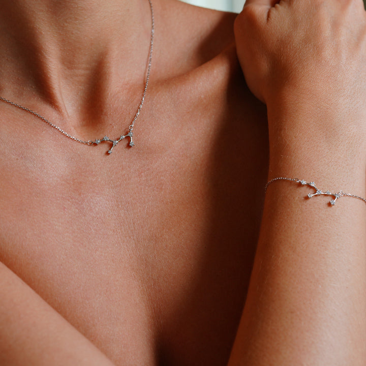 This necklace is crafted from 925 sterling silver and is plated in rhodium for a silver finish. It features a charm depicting the Virgo constellation with cubic zirconia detailing. The fine link chain is adjustable.