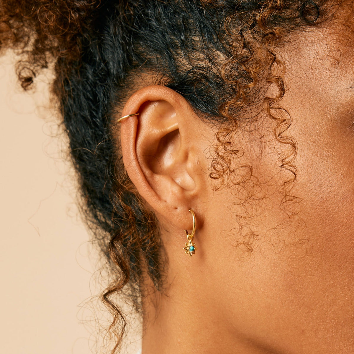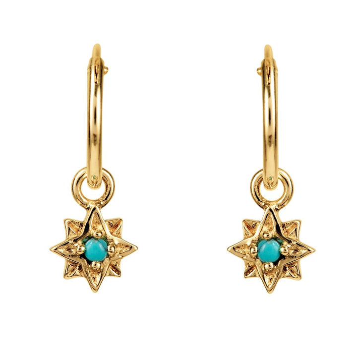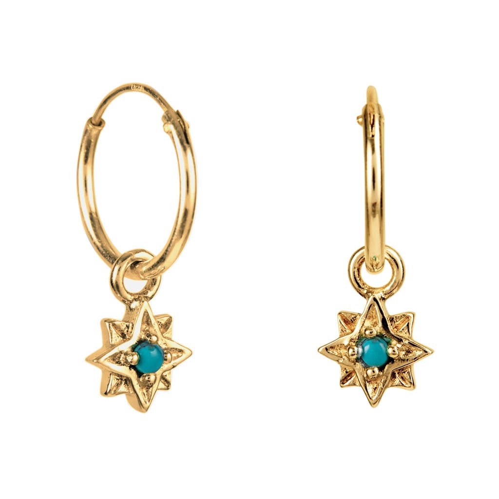 These Guiding North Star Gold Vermeil Huggie Hoop Earrings - Turquoise by Charlotte’s Web Jewellery channel the celestial magic of the North Star. Tiny star charms hang gracefully from classic hoops, each centered with turquoise, December’s birthstone, revered for its healing, protective, and soothing energy. Symbolising guidance and strength, these earrings celebrate life’s journeys while offering an enchanting touch of colour and light.