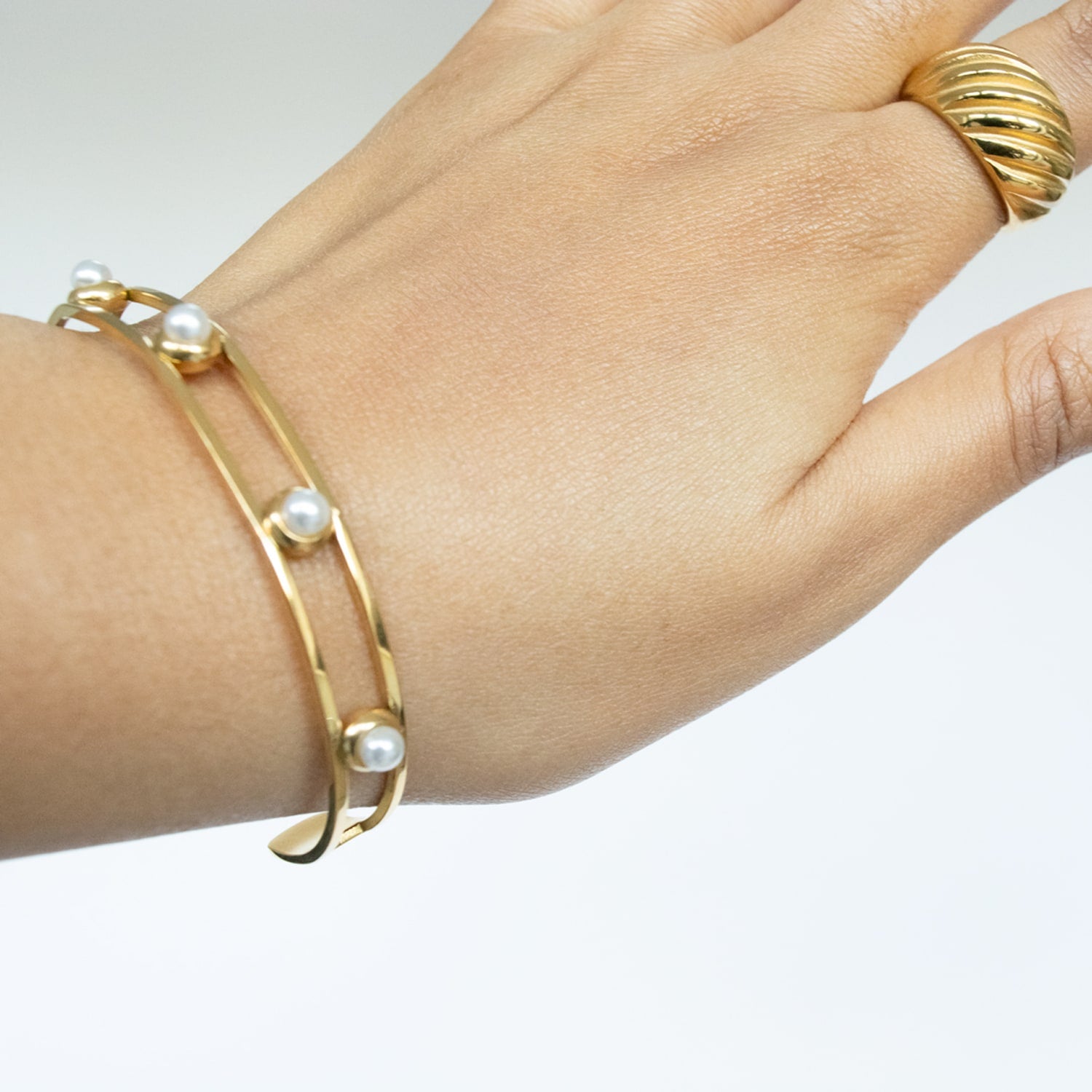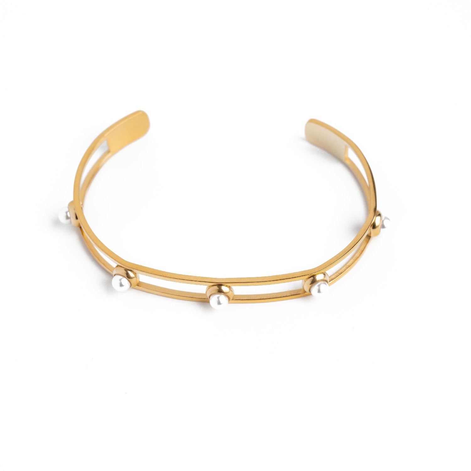 This adjustable bangle is made from 18k gold stainless steel and features a pearl. It is tarnish-free and hypoallergenic.