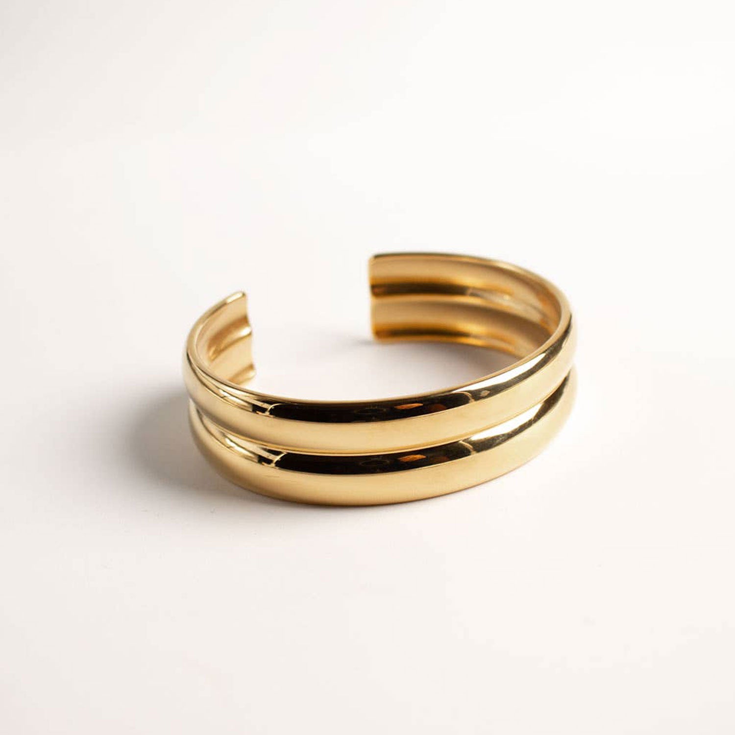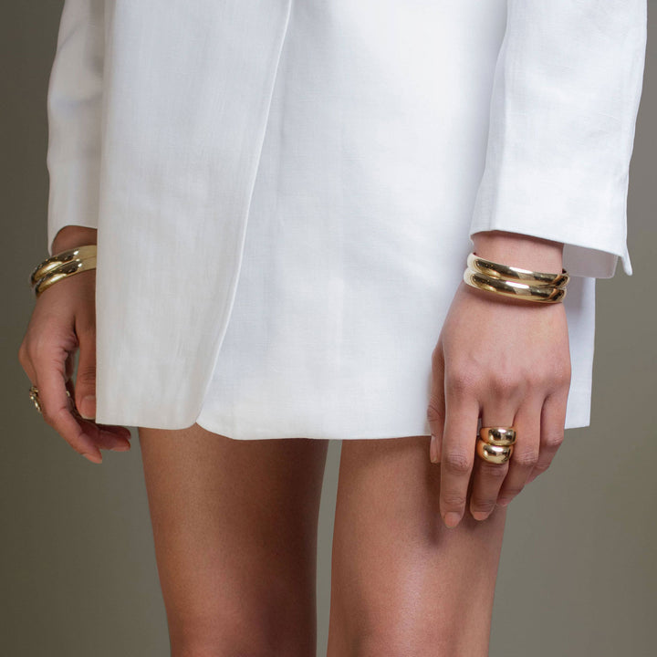 This Mia Gold Minimalist Bangle by Outofoffice is a modern essential with a sculptural silhouette. Its sleek form and radiant gold finish exude contemporary elegance while remaining versatile enough for stacking or wearing solo. Lightweight yet impactful, the bangle elevates everyday looks, embodying a minimalist aesthetic designed for timeless wear.