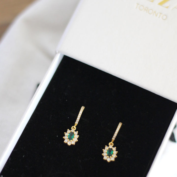 These earrings are made with a 100% recycled sterling silver base with a thick layer of high-quality 14k gold plating. They feature an oval-cut green gemstone and an engraved cubic zirconia stone.