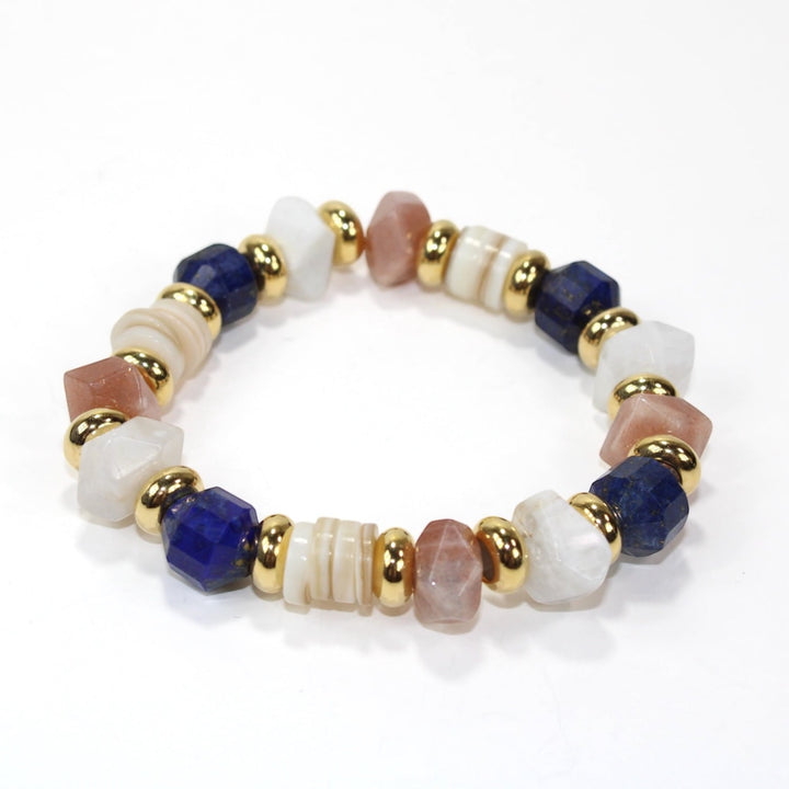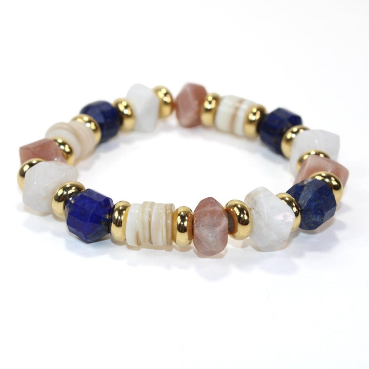 Handcrafted with Moonstone, Lapis Lazuli, Sunstone, Mother of Pearl, and gold-plated brass accents. Adjustable length: 17–20 cm. Each stone unique in shape and color.