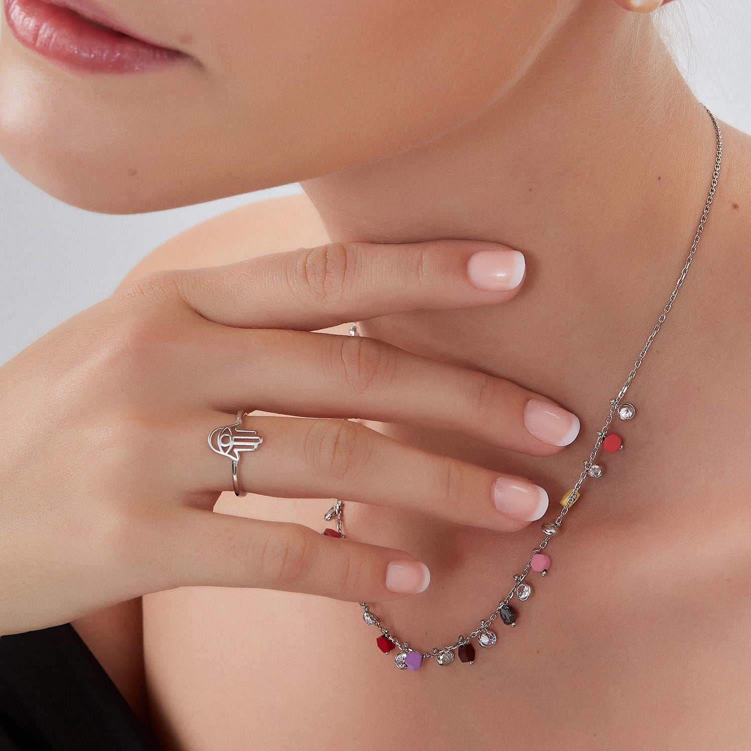 This Hamsa Hand Adjustable Ring by Spero London is a quirky and playful piece perfect for warding off bad vibes. Its classic Hamsa Hand motif, a symbol of protection, adds a touch of bohemian charm and spiritual significance to your outfit. Crafted from high-quality sterling silver, this adjustable ring is a staple that combines style with a meaningful purpose.