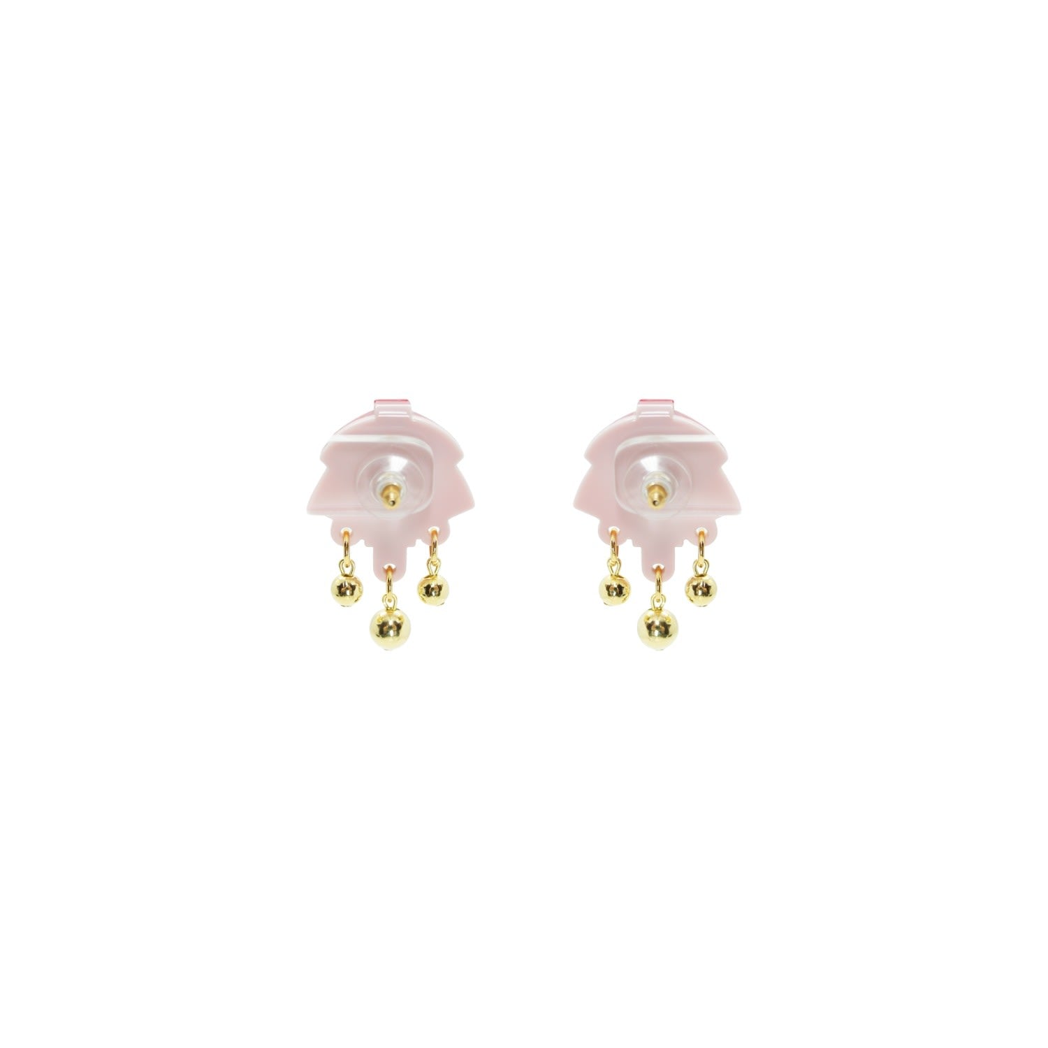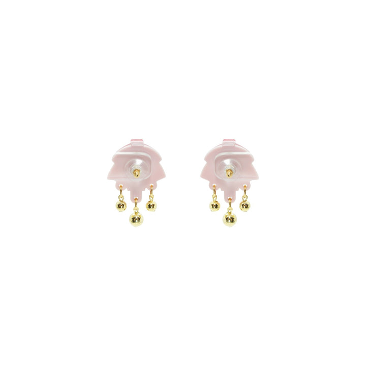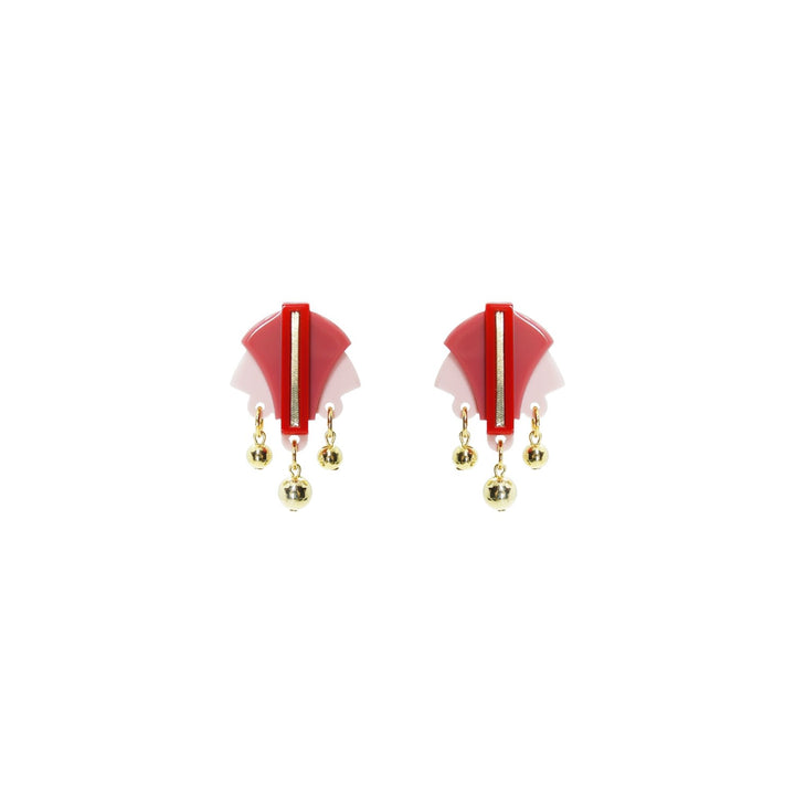 These earrings are handmade from acrylic with ABS beads, a golden-finished brass chain application, and a stainless steel pin. Due to the handmade process, small variations in color and finish are expected.