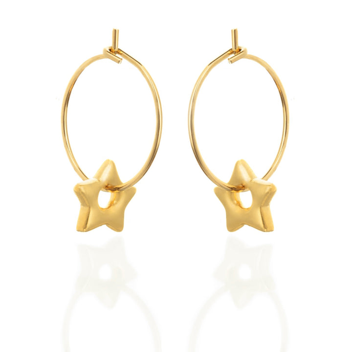 These hoop earrings are crafted from 16k gold plated metal. They are designed to hug the earlobe and feature star motifs.