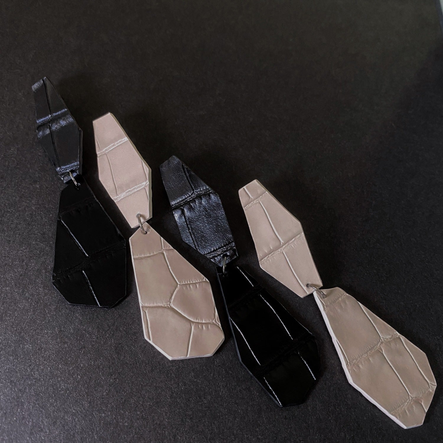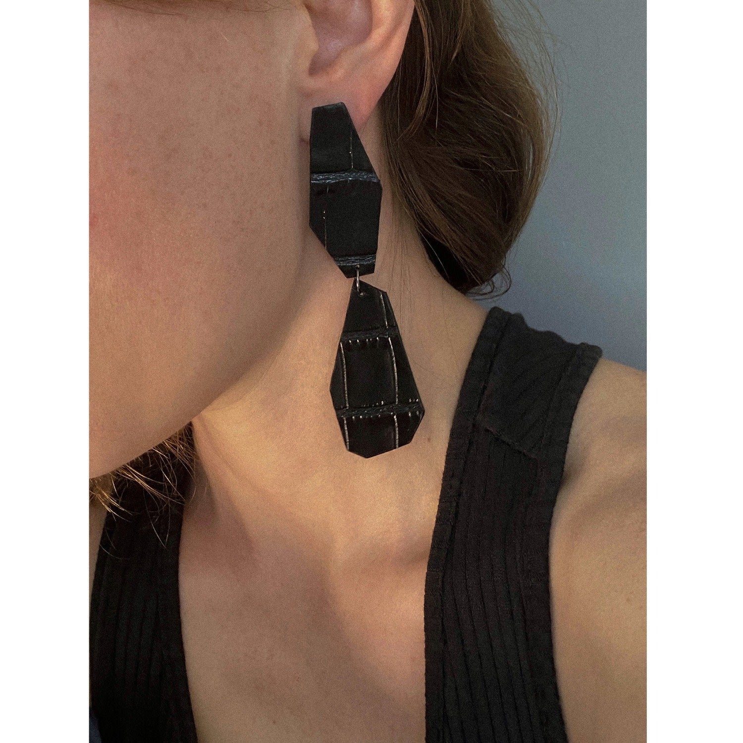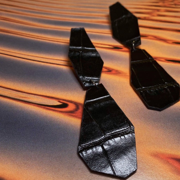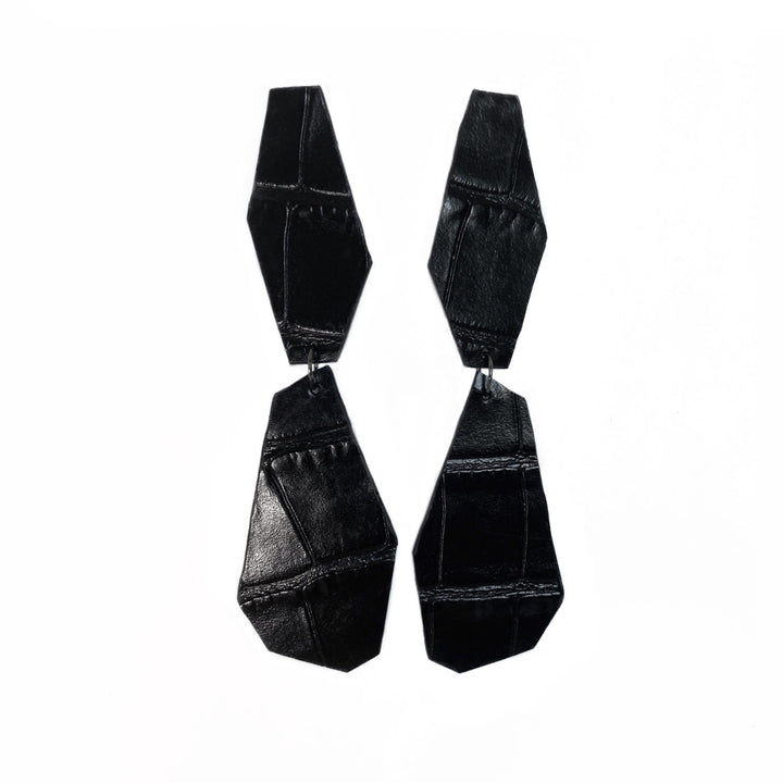 These earrings are crafted from a locally sourced leather-like material with onyx black coloring.