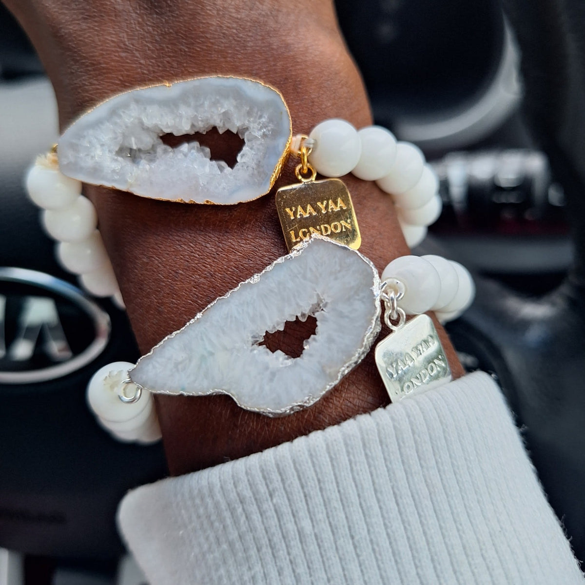 This stretch bracelet is made with natural agate, white/grey agate geode stone, and a 925 sterling silver tag coated in 1 micron of 18-karat gold. The stones are unique.