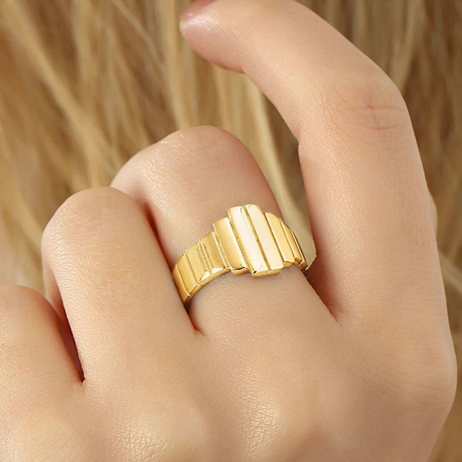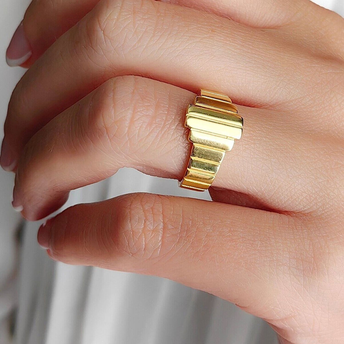 This ring is made from 925 recycled sterling silver and has a gold tone. It features multiple layered rectangular bars.