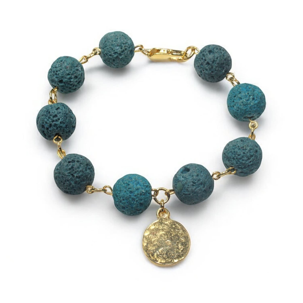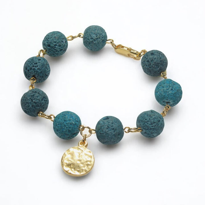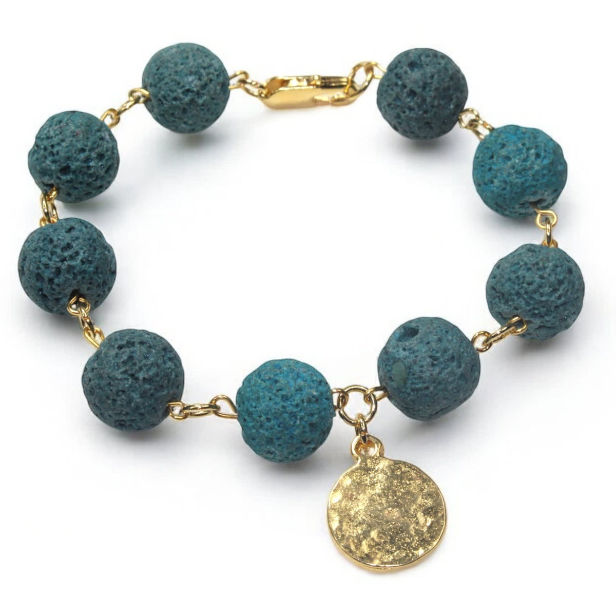 Handmade from natural lava stone beads and gold-plated brass. Adjustable length: 17–20cm.