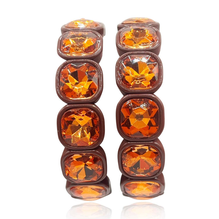 These bracelets are made with brown enamel and topaz crystals. They are a stretch design that fits all wrist sizes.
