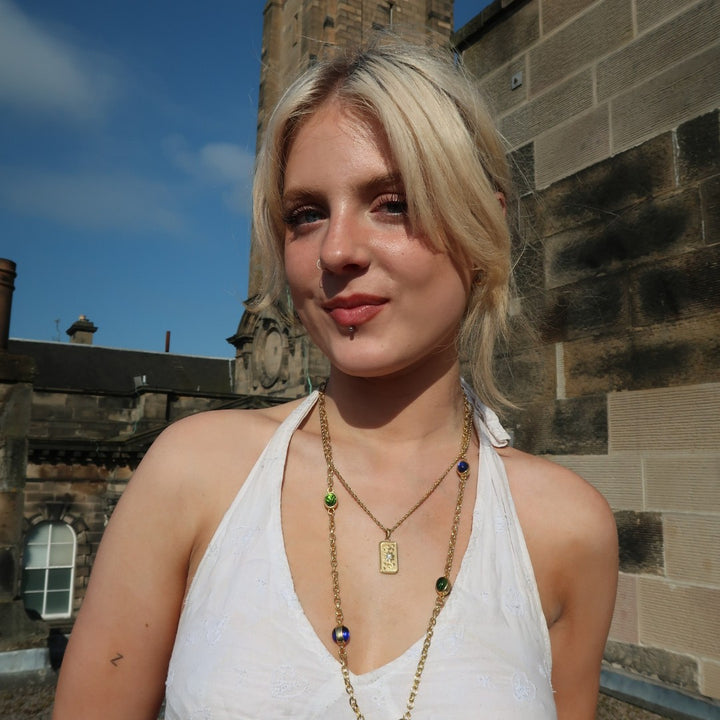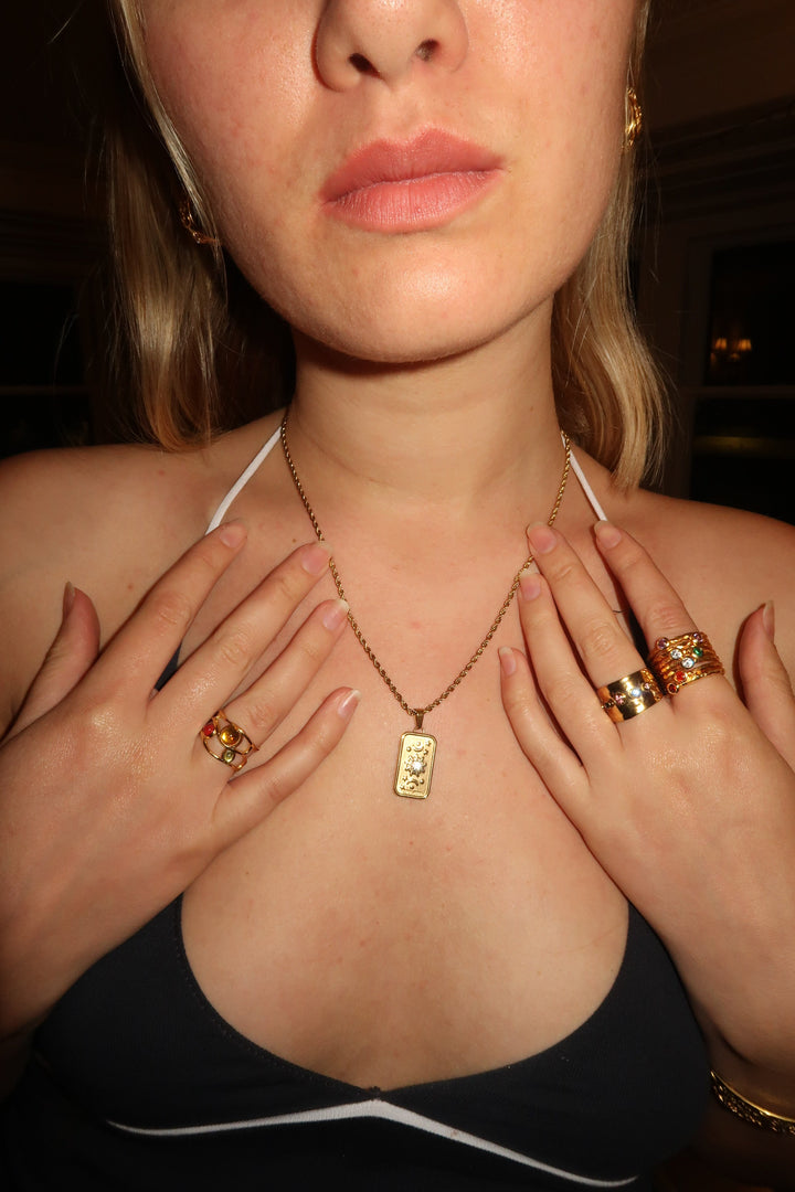 This Lila's Sun Necklace by Recreation Jewels is a tarot-inspired piece that symbolizes positivity, joy, and new beginnings. The pendant features an engraved sun tarot card, bringing a touch of mysticism and enlightenment to your daily wear. Crafted for comfort and durability, this waterproof and hypoallergenic necklace is a versatile and meaningful accessory for all of life's adventures.