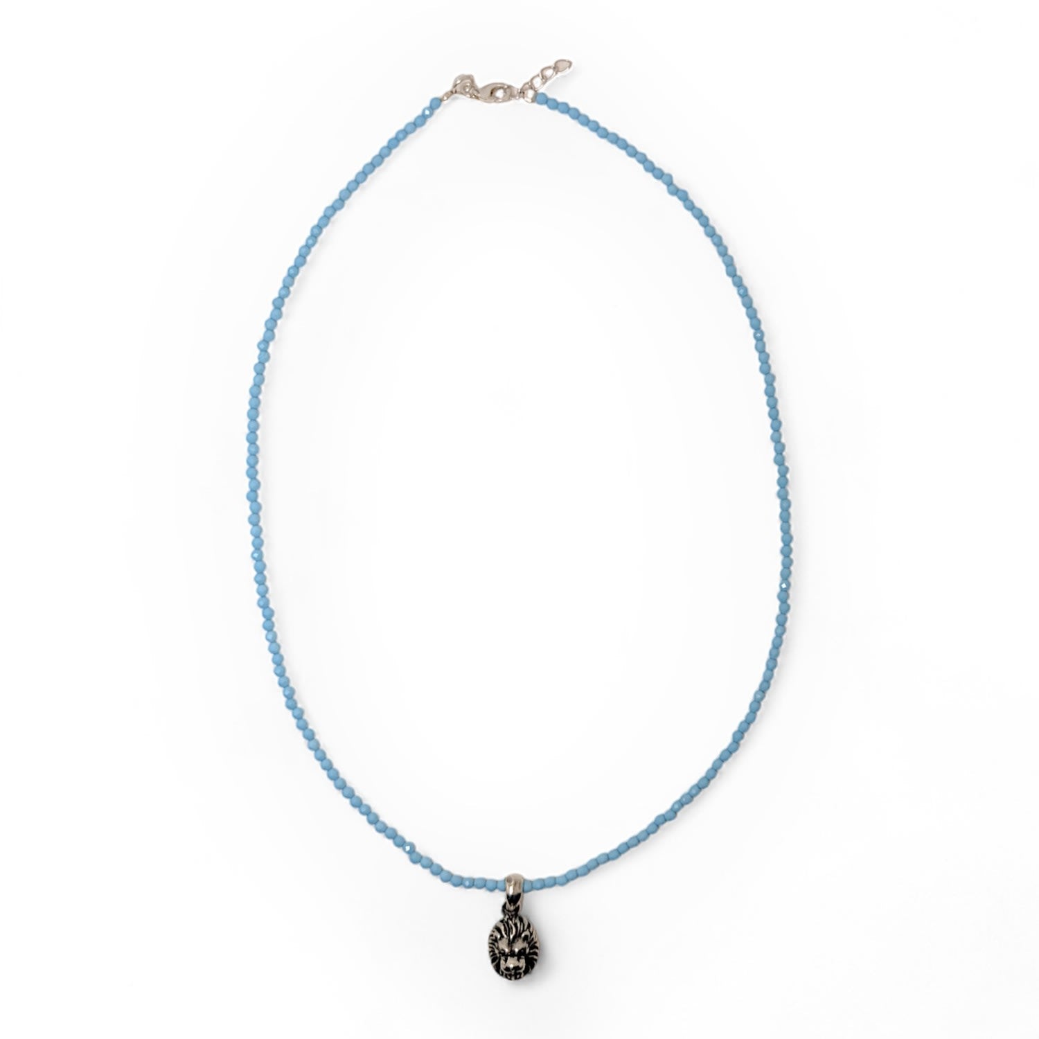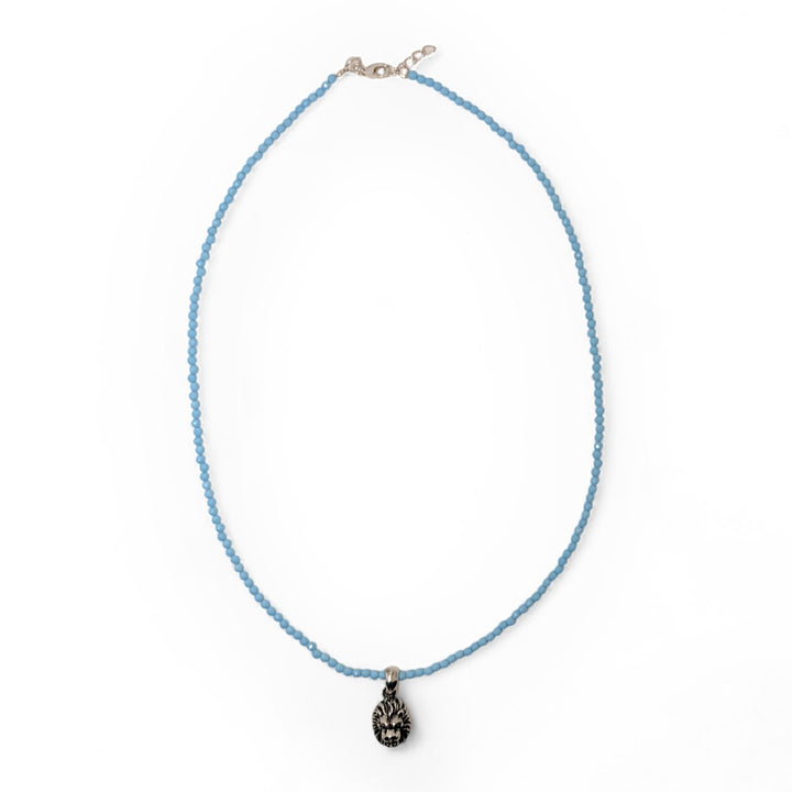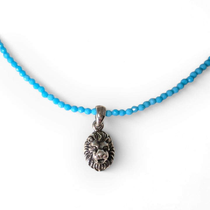 The Silver Lion Pendant Turquoise Bead Necklace by Fable and Mirth symbolizes strength, courage, and leadership. Genuine turquoise beads meet a finely detailed silver lion head pendant for a striking, powerful piece with protective energy.