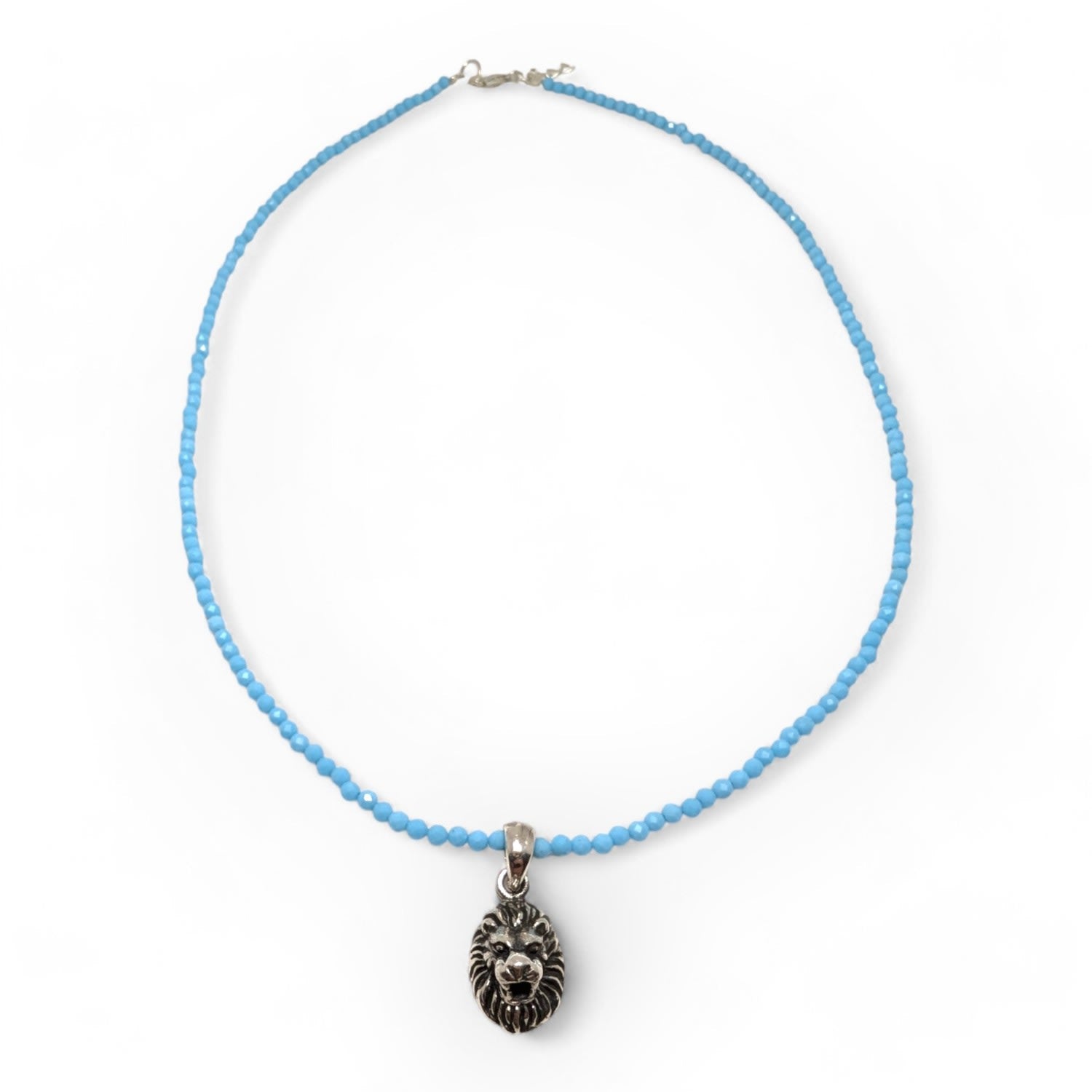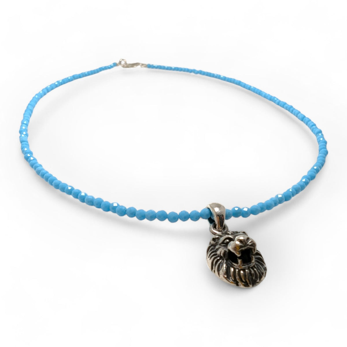 Genuine turquoise beads. Sterling silver lion head pendant.