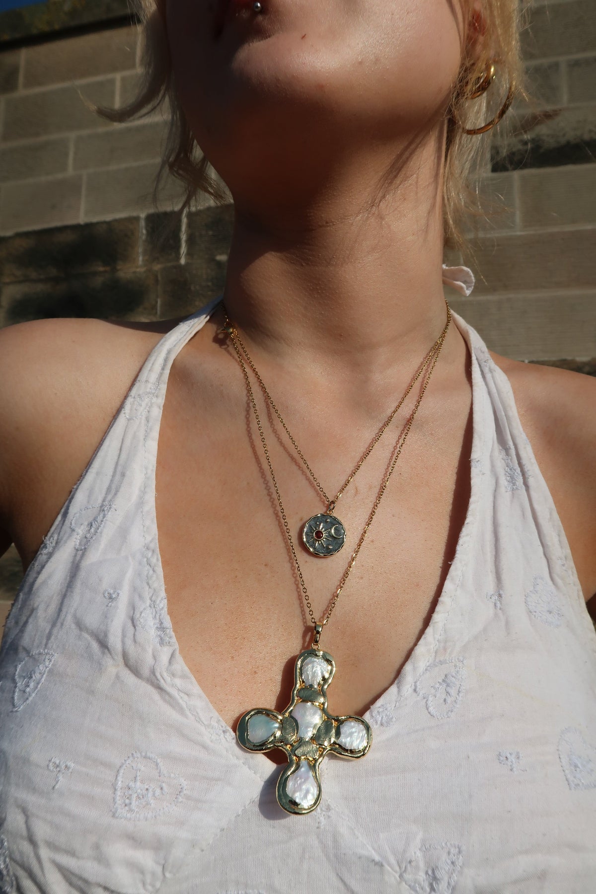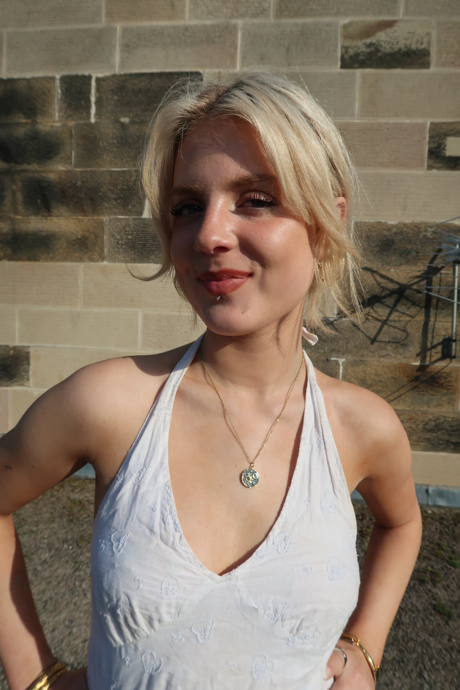 This Chloe's Sun & Moon Pendant Necklace by Recreation Jewels is an enchanting piece that symbolizes the beautiful balance of light and darkness, energy and tranquility. The striking blue pendant, featuring both a sun and a moon, adds a touch of whimsical elegance to your look. This necklace is designed for both day and night, making it an ideal accessory for any occasion. Its modern, celestial aesthetic is perfect for those who appreciate jewelry with a deeper, symbolic meaning.