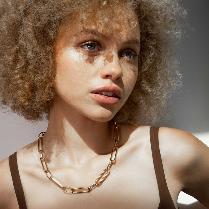This Minimal Chain Gold Necklace by Outofoffice is a beautiful and understated piece that adds a touch of effortless elegance to any outfit. Its polished large links and seamless clasp create a modern, minimalist aesthetic that is perfect for layering or wearing as a simple statement piece. Designed to last a lifetime, this necklace embodies a timeless sophistication that transcends trends, making it a cherished accessory for those who appreciate lasting style and quality craftsmanship.