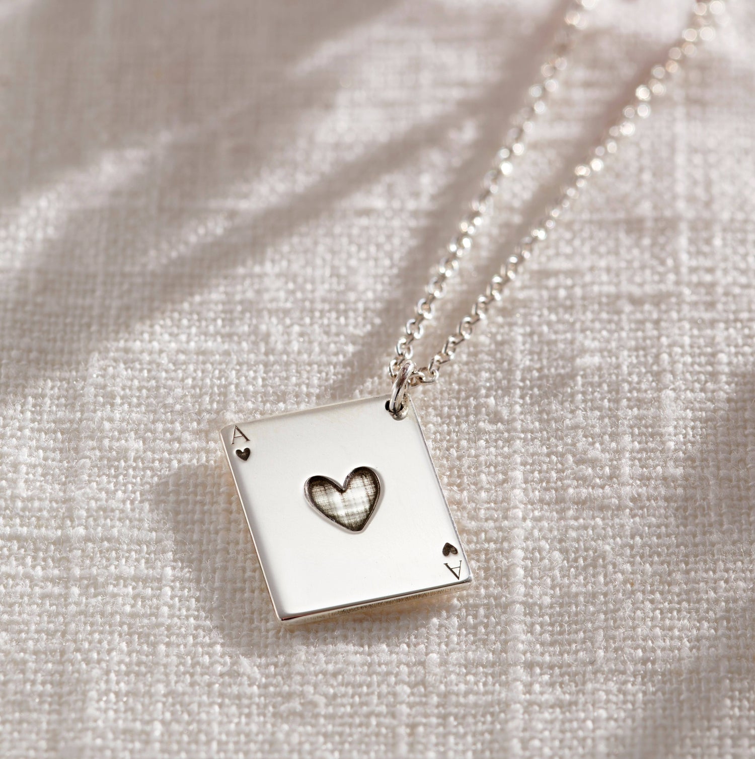 The Ace Of Hearts Playing Card Charm Necklace by Posh Totty Designs is a beautifully handmade piece that celebrates love and luck. Crafted from recycled Sterling Silver in the Brighton workshop, the charm features delicate and intricate hand-engraved details. Whether worn alone for a minimalist statement or layered, this necklace is a heartfelt gift for someone special or a perfect keepsake for a card enthusiast.