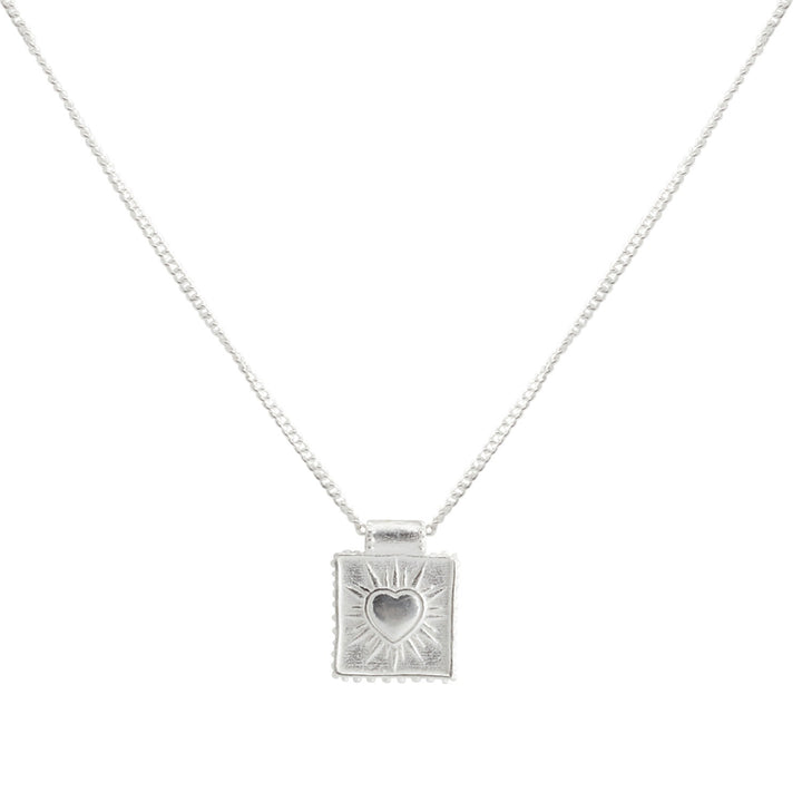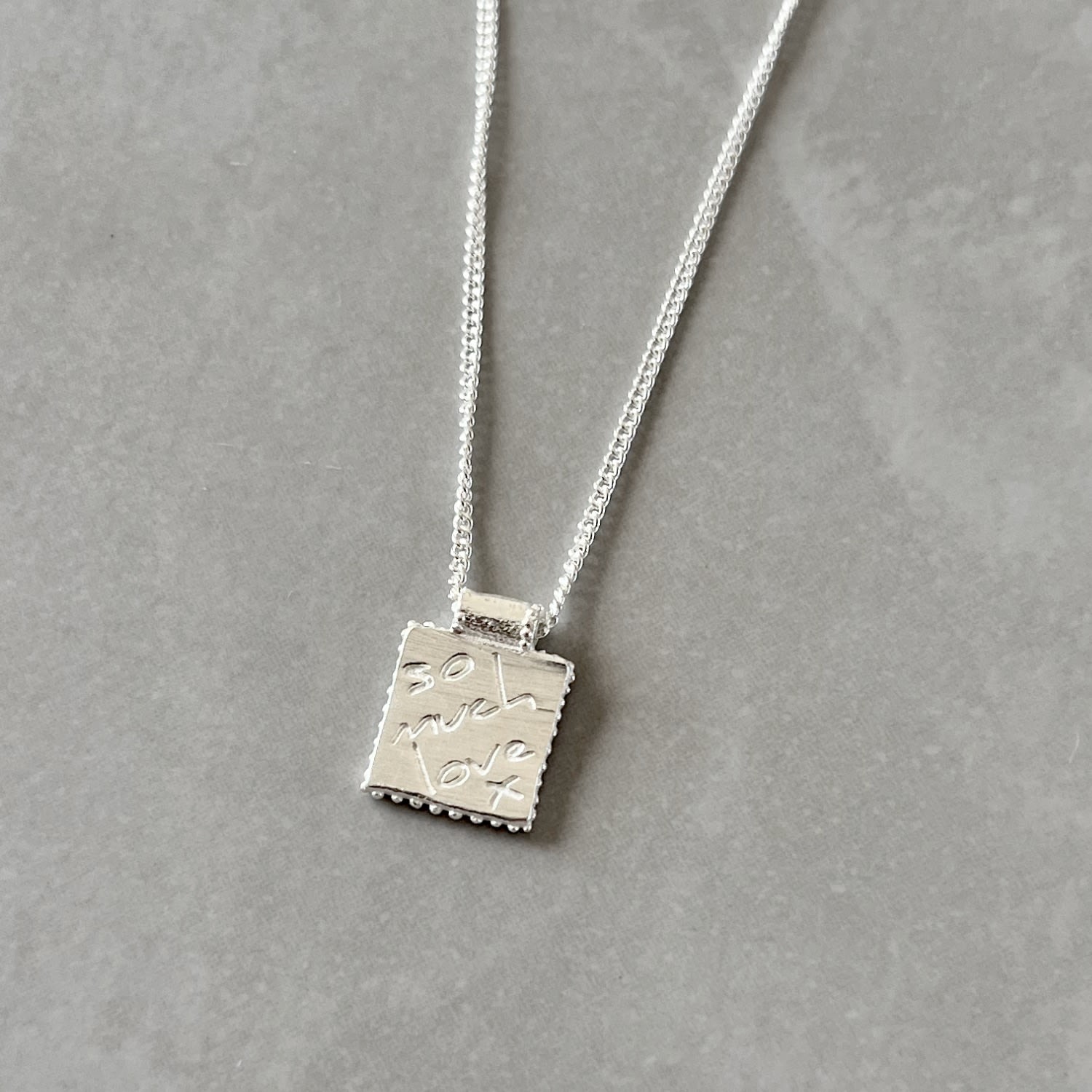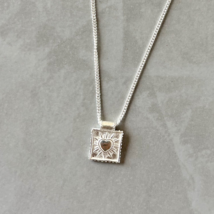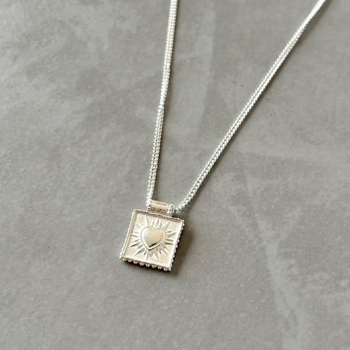 This necklace is made from recycled sterling silver with a 12-inch sterling silver chain and a 2-inch extender. The pendant measures 10mm x 12mm.