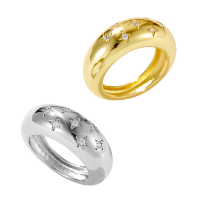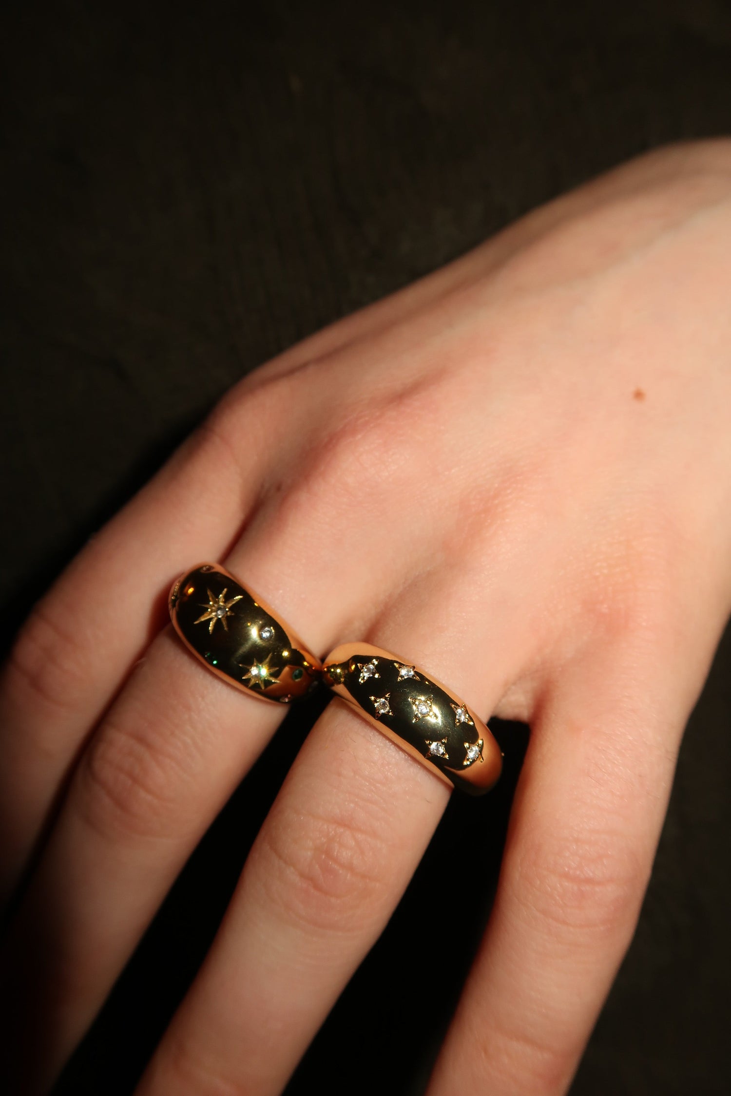 This waterproof and hypoallergenic ring is expertly crafted from 925k sterling silver with 18k gold plating. It is available in sizes 6, 7, and 8.