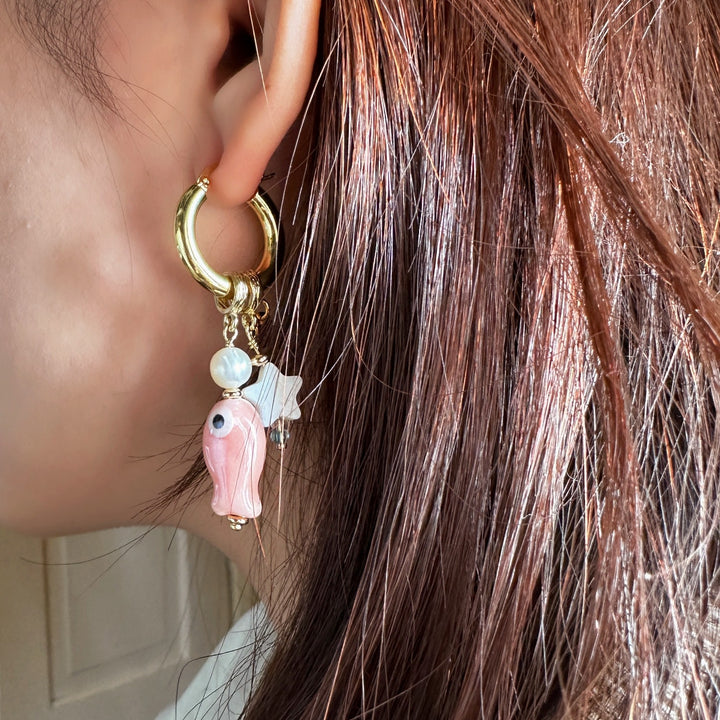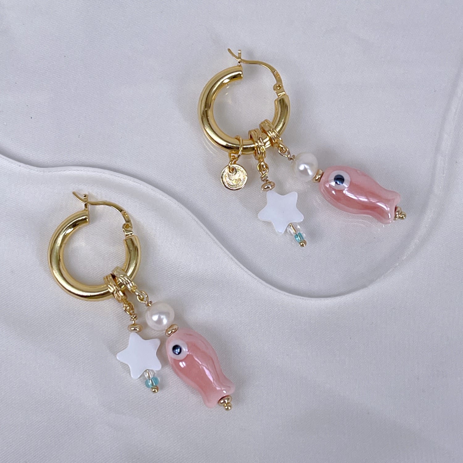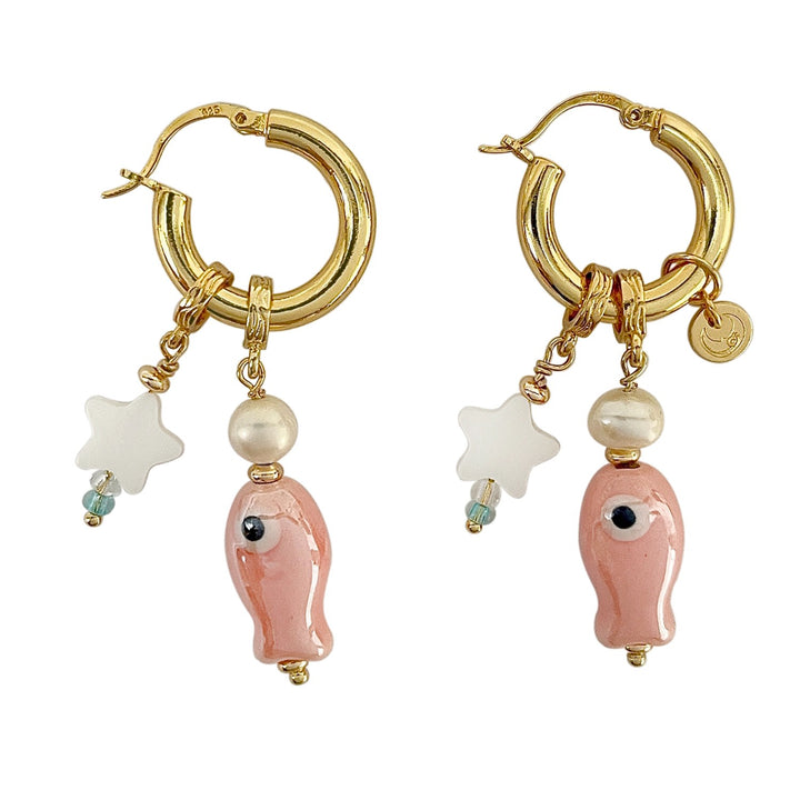 Style Notes: These Aquatic Companions Earrings - Pink by Ninemoo are enchanting. Inspired by the dance of ocean waves, they feature delicate ceramic fish, lustrous pearls, and gleaming seashells that unite to create a symphony of romance. The golden hoops evoke a sunlit coastal breeze, embodying the magic of a seaside love story. The unique combination of materials adds a touch of bohemian elegance.