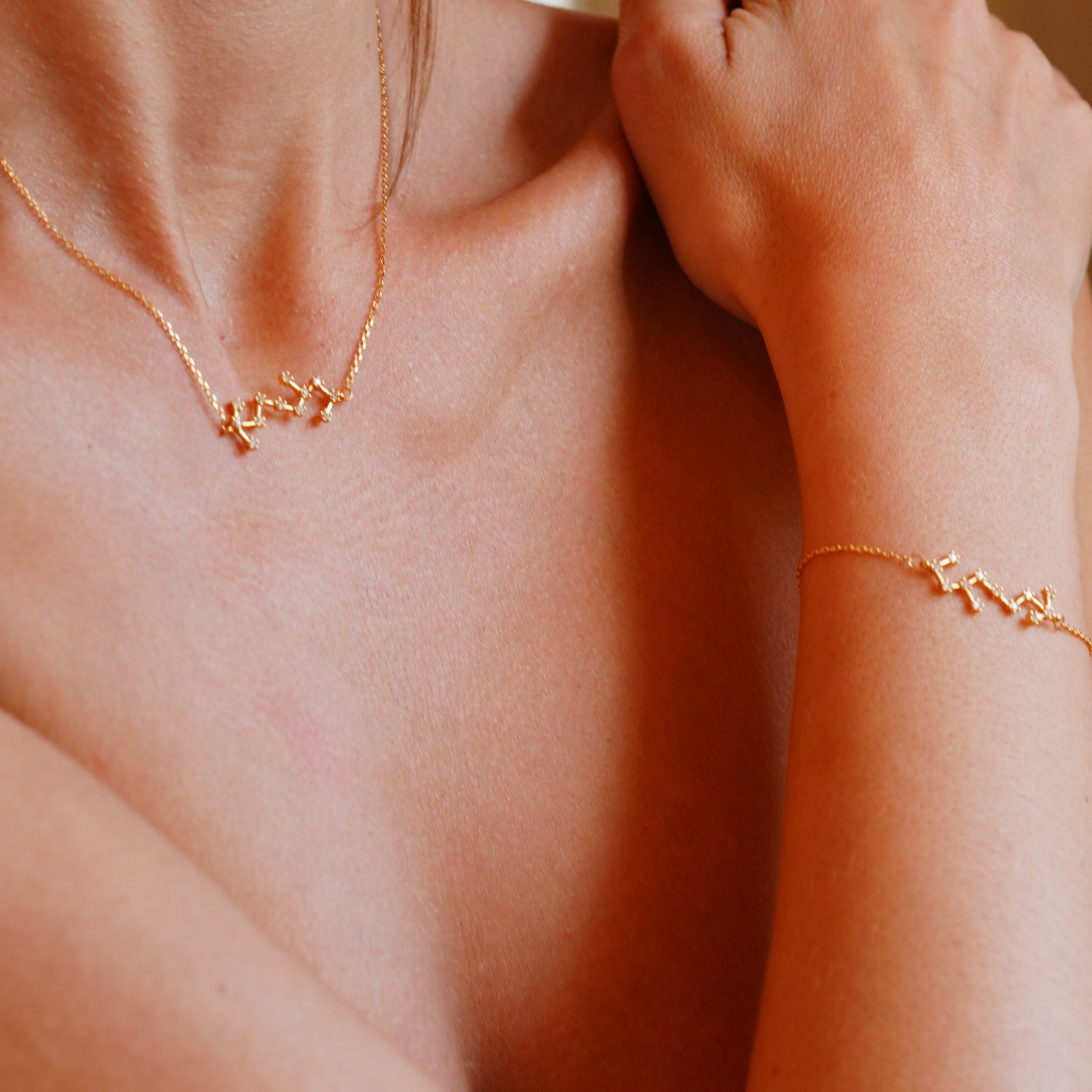 This necklace is made from 925 sterling silver and is plated in 18ct gold. It features a cubic zirconia constellation design.