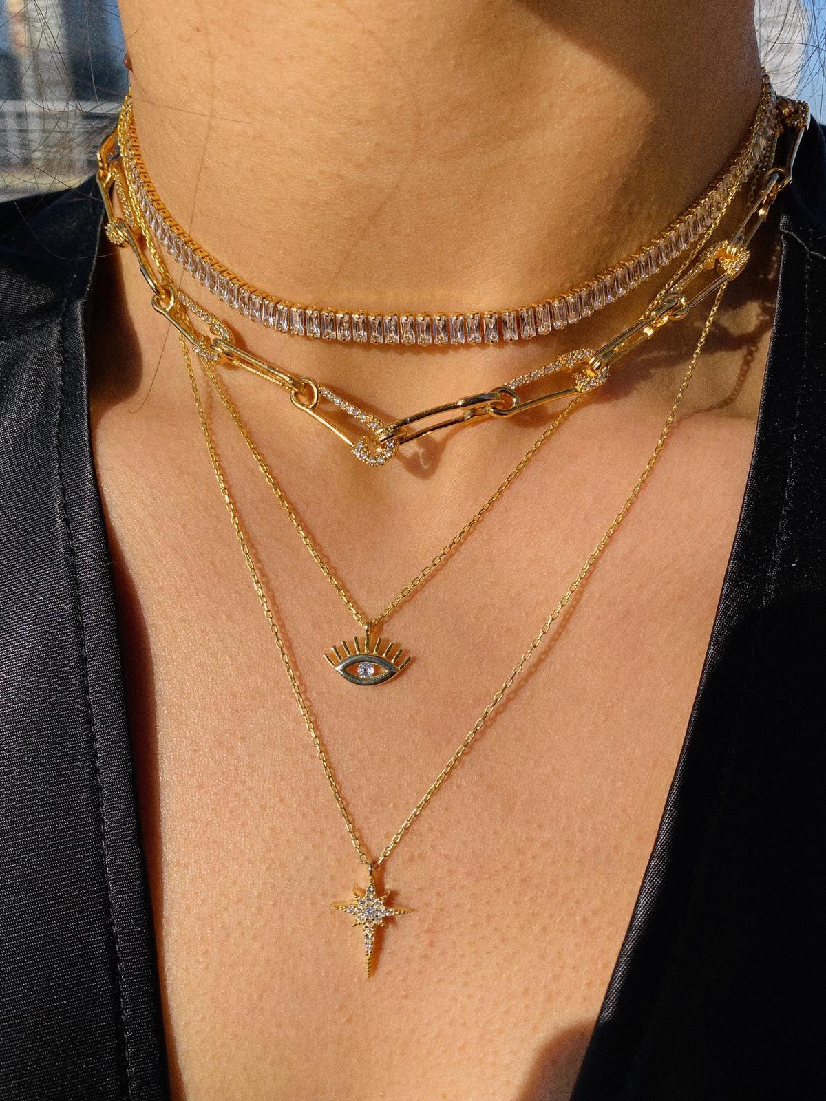 This necklace is crafted from 925 recycled sterling silver with a gold tone. It features a celestial starburst design with cubic zirconias and has an 18-inch adjustable chain. Wipe with a jewelry cleaning cloth and keep away from chemicals.
