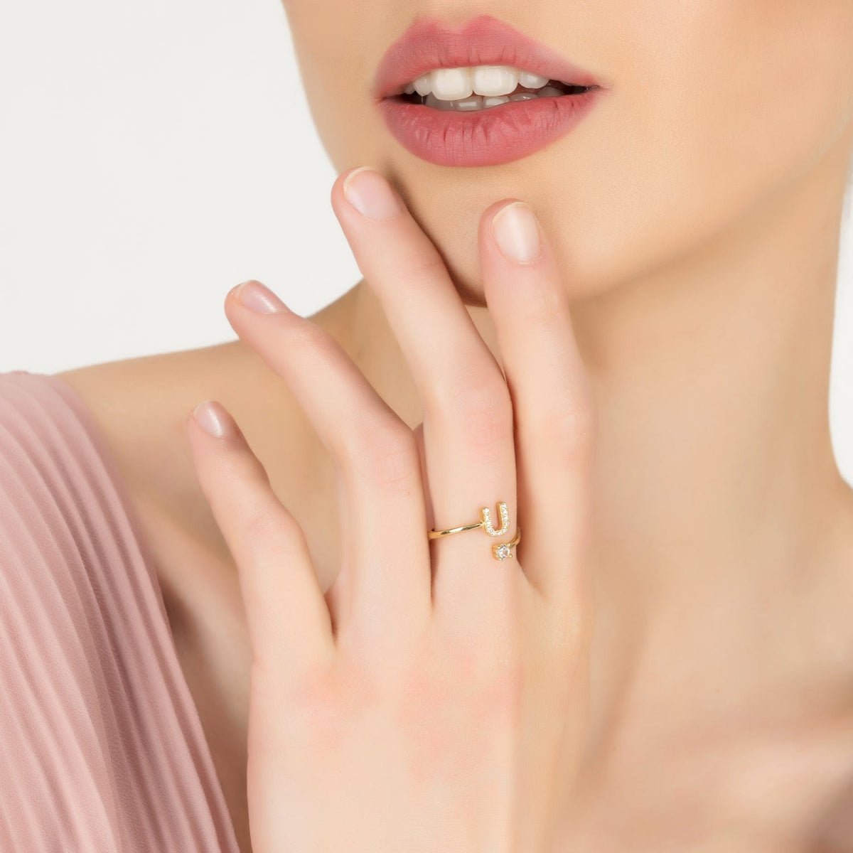 The Initial Ring Gold U by Latelita is a simple and delicate personalized accessory. This open-band ring is handcrafted from 925 sterling silver and dipped in 18ct gold. It features a zircon-adorned monogram on one side and a single larger cubic zirconia on the other. The design is slightly adjustable and looks great when stacked with other rings.