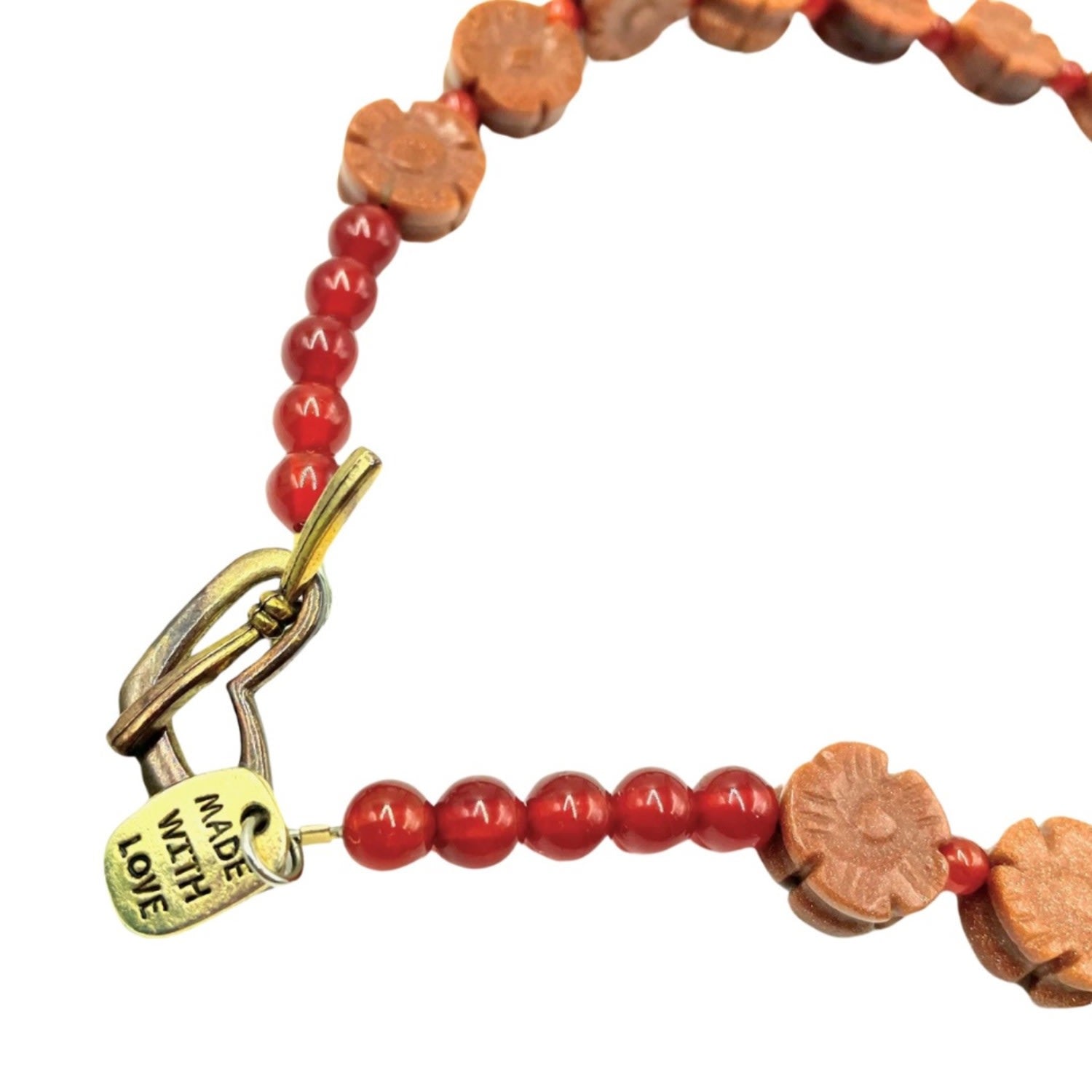This necklace features carved daisy goldstone beads and carnelian beads, secured with a heart-shaped toggle clasp.