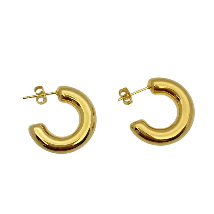 These hoops are made from a stainless steel base with a thick layer of 18k gold plating. They are waterproof and tarnish-free.