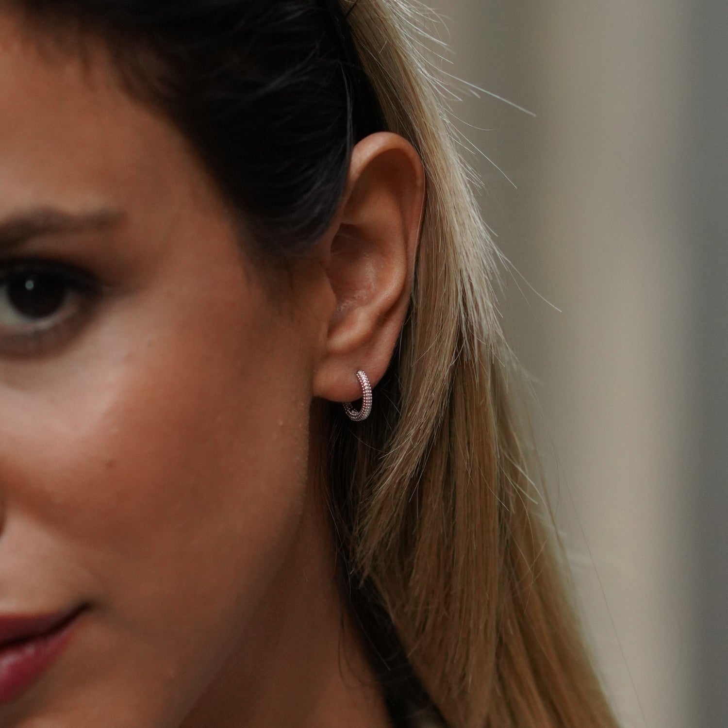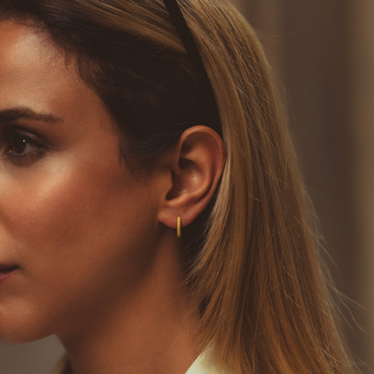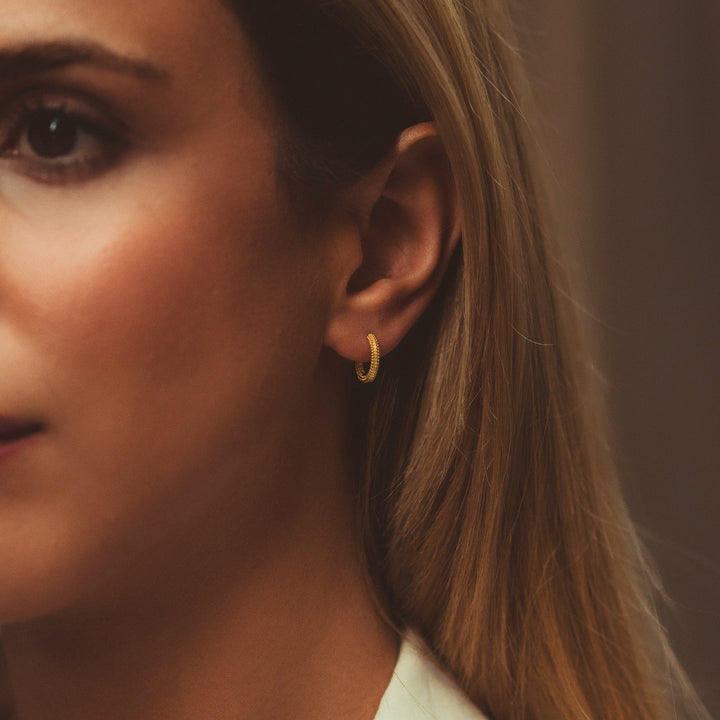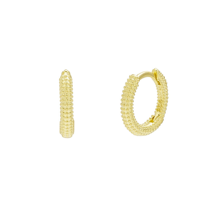 These Sterling Silver Textured Pebble Hoops - Gold by Spero London are an ode to minimalist elegance with a modern twist. The unique, organic texture of the pebbles adds a tactile dimension to the classic hoop design, catching the light with a soft, sophisticated gleam. These earrings are a versatile staple, designed for the individual who values subtle detail and a quiet sense of style, perfect for transitioning effortlessly from day to night.