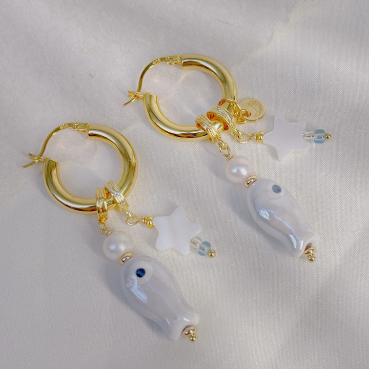 These Aquatic Companions Earrings - Silver by Ninemoo are enchanting. Inspired by the dance of ocean waves, they feature delicate ceramic fish, lustrous pearls, and gleaming seashells that unite to create a symphony of romance. The design allows the golden hoops to embrace you in the warmth of a sunlit coastal breeze, embodying the magic of a seaside love story.