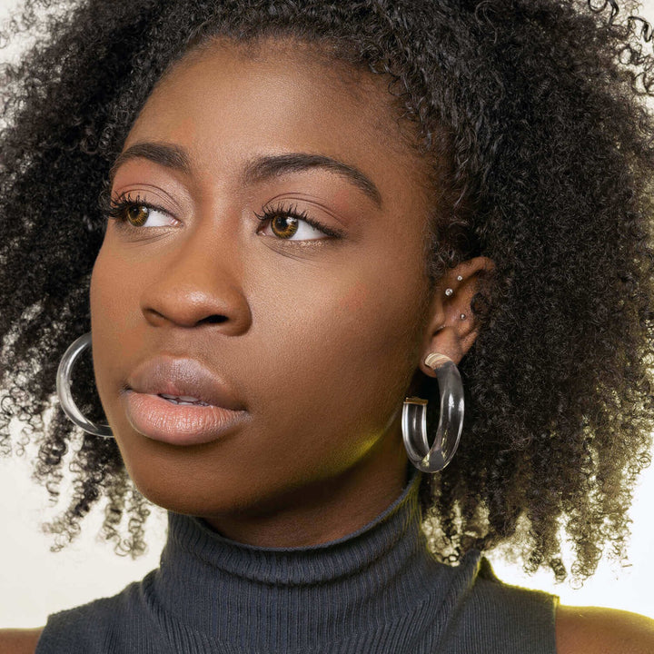 These earrings are handcrafted from lightweight, crystal clear lucite. They feature gold-plated sterling silver posts and are designed to be a versatile, clear hoop.