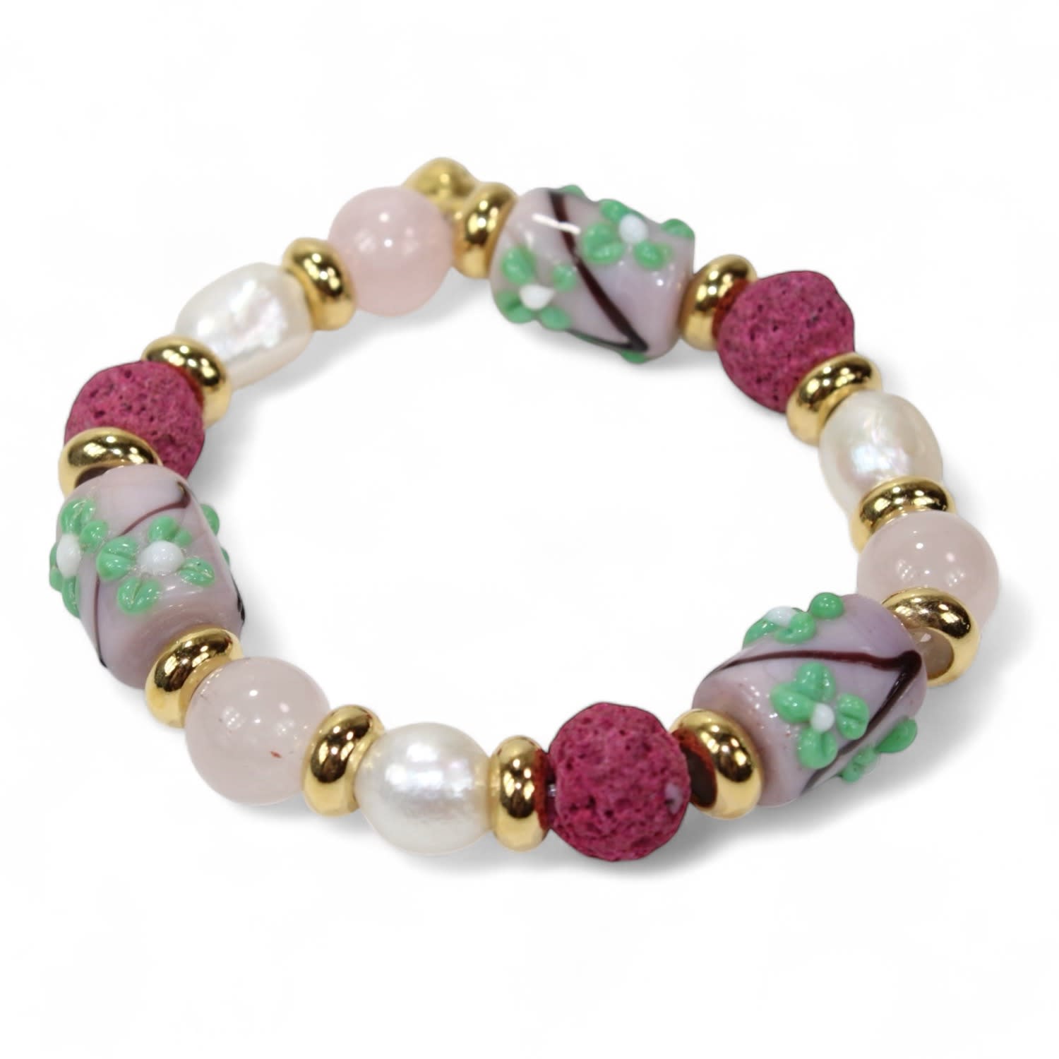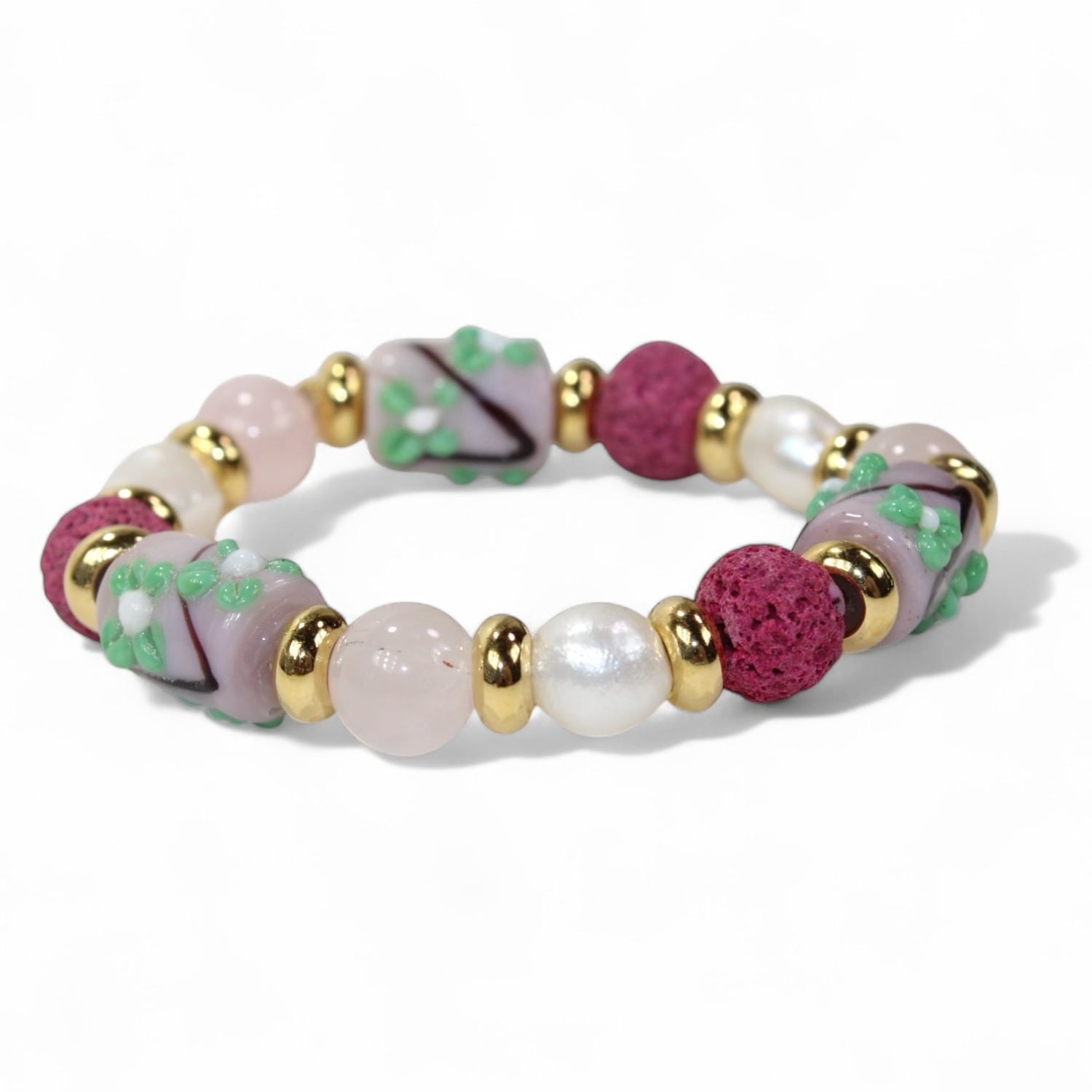 This bracelet is handcrafted using artisan glass beads, genuine freshwater pearls, lava stone, rose quartz, and gold-plated brass components. It is adjustable between 17-20 cm.