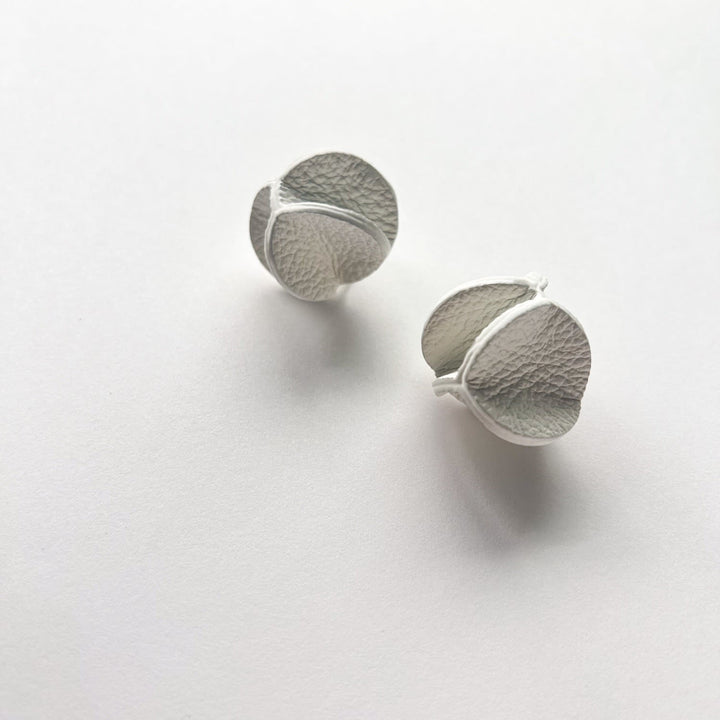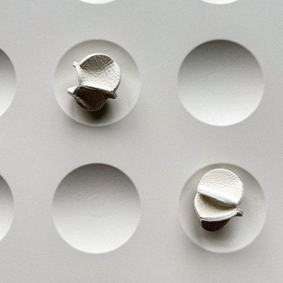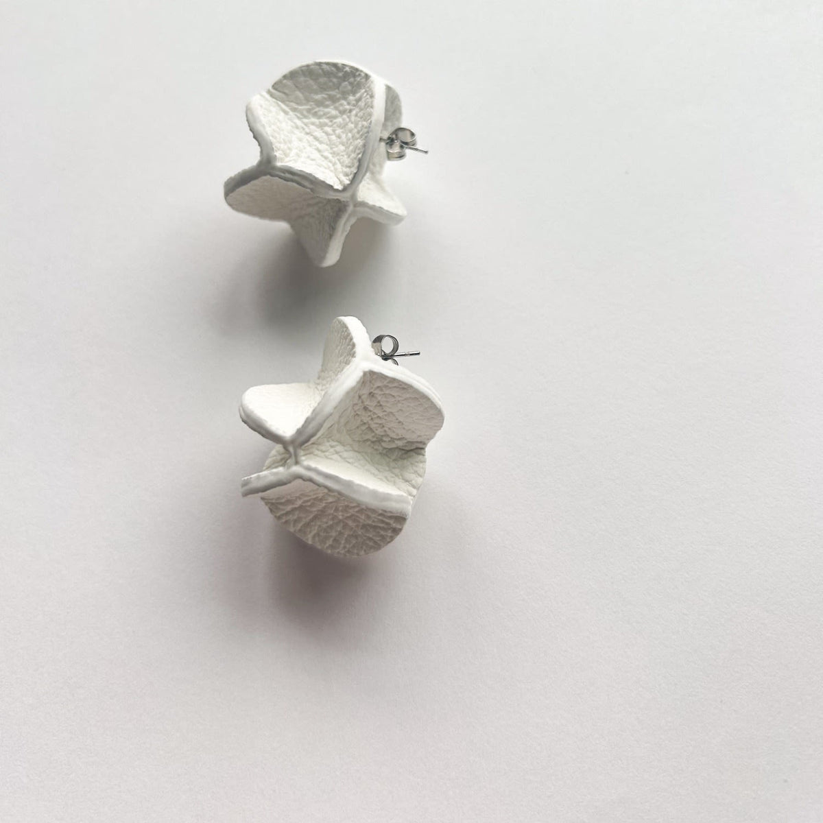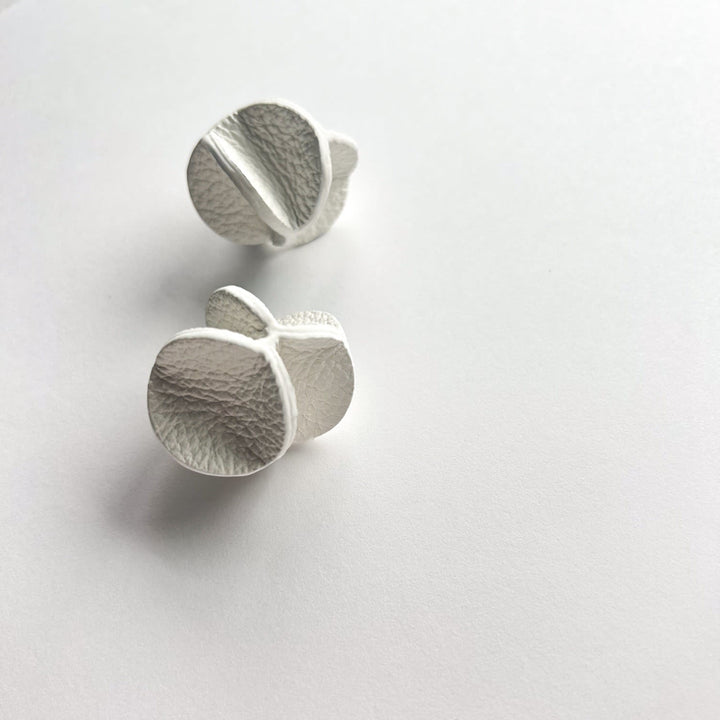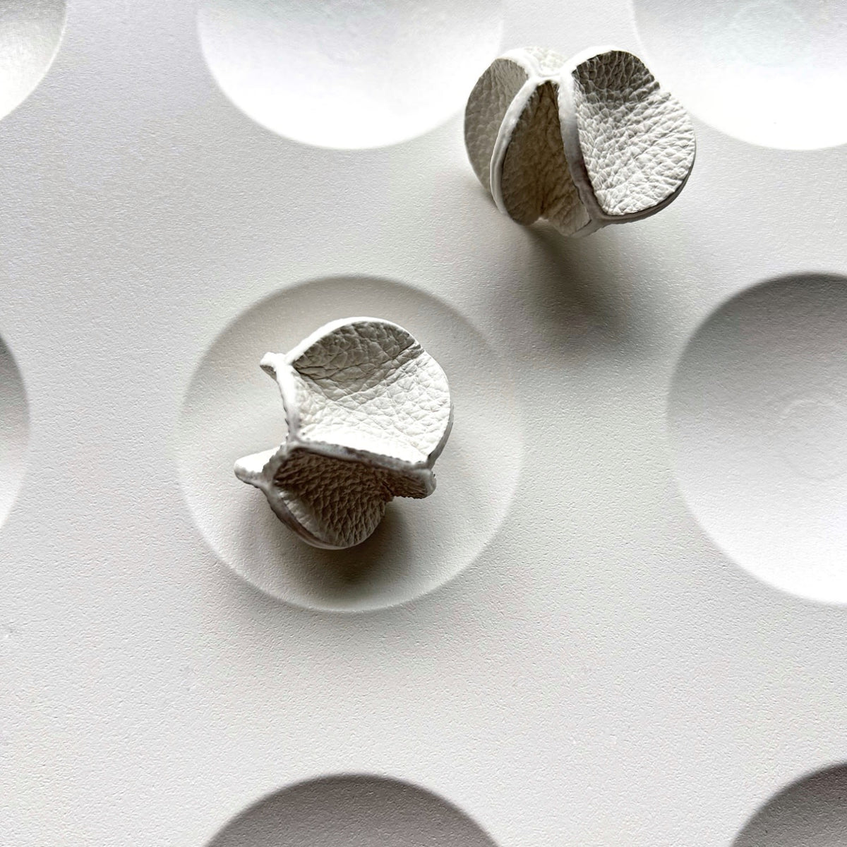 These earrings are handmade from high-quality leather. The color is white. They are shaped to create a multi-dimensional effect.