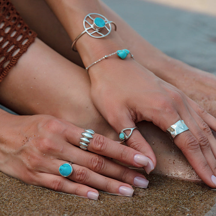 This adjustable ring is made of silver and features natural turquoise gemstones. The gemstones range in size from 7mm to 12mm. It should be taken off when washing hands or using cosmetics.